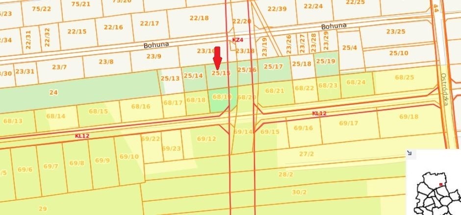 Działka 68/19 graniczy z korytarzem tras komunikacji kołowej o symbolach KZ4 od wchodu planowana droga o kategorii zbiorczej oraz od północy – KL12 ulica Projektowana