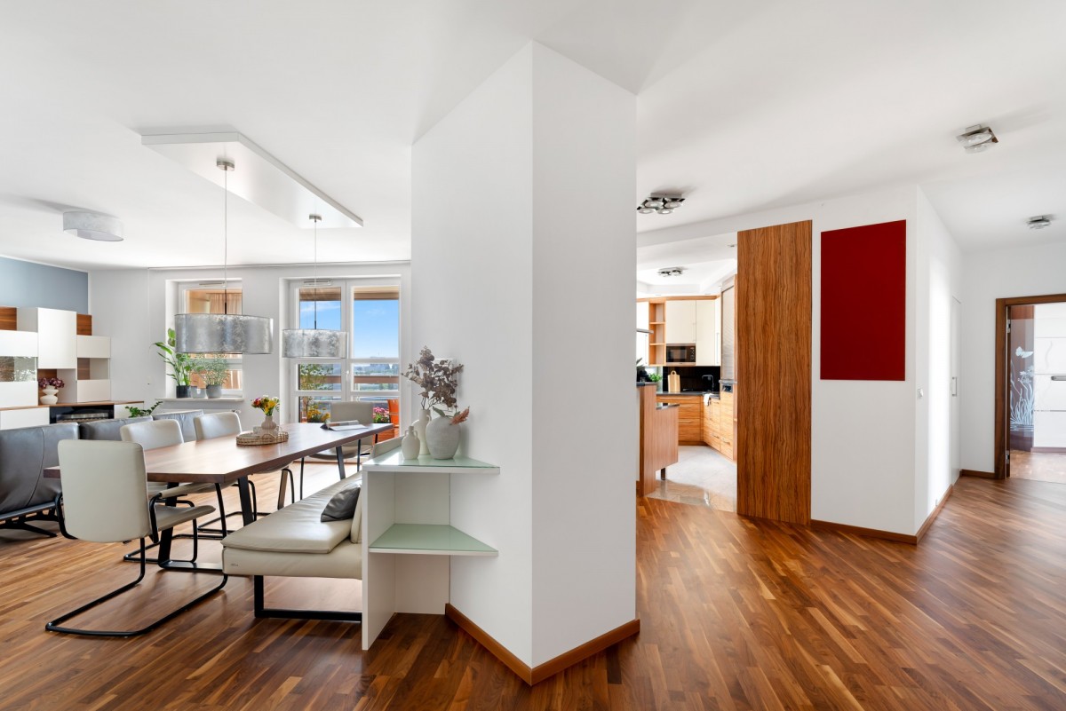 Poranki wysoko nad miastem, światło wpadające przez duże przeszklenia i przestrzeń zaprojektowana do komfortowego życia sprawiają, że ten apartament wykracza poza standard centrum Warszawy.
