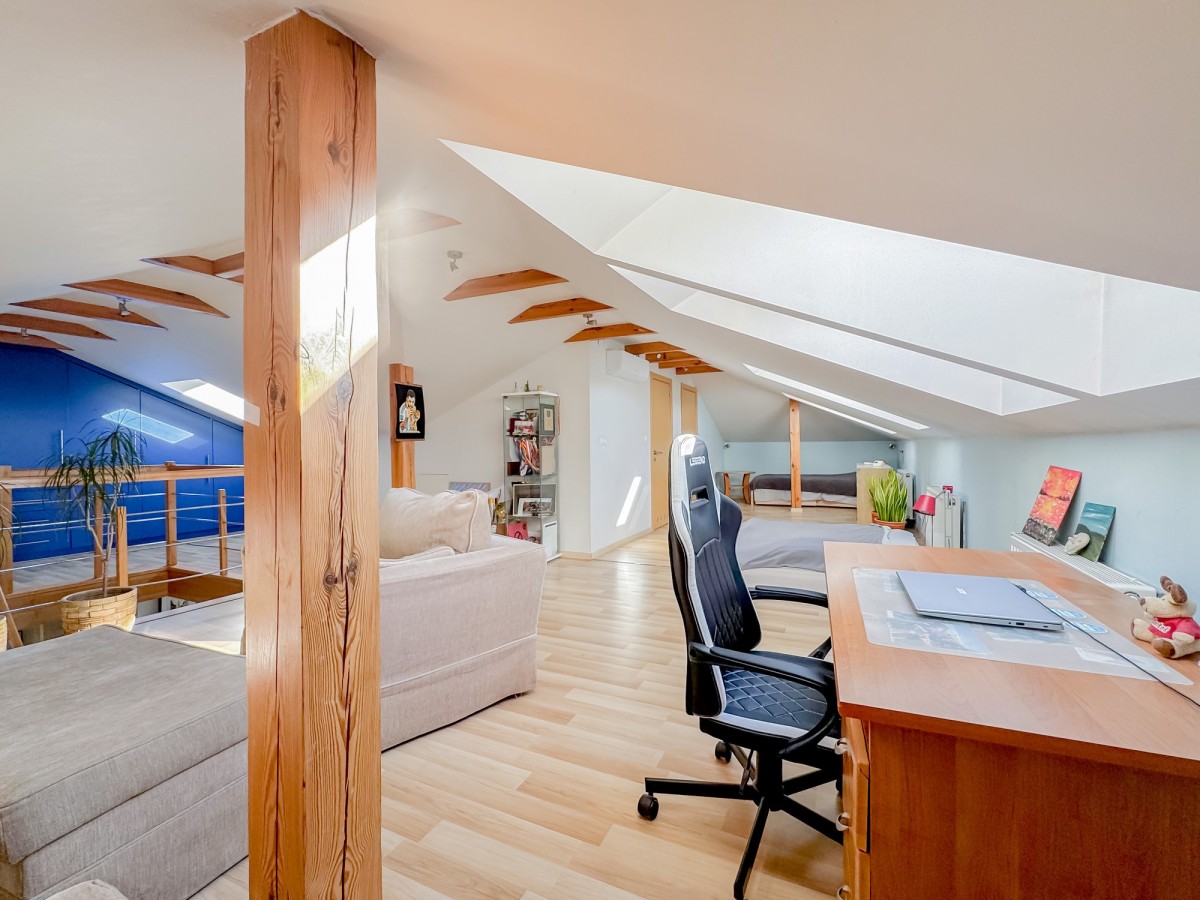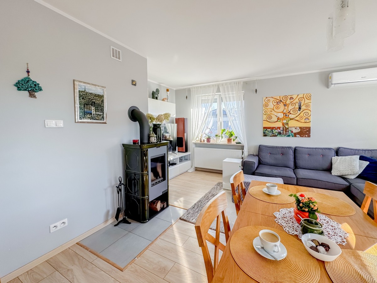 Przedstawiam funkcjonalne, bezczynszowe, dwupoziomowe mieszkanie o powierzchni 147,5 mkw mieszczące się w budynku wielorodzinnym, sześciolokalowym. Mieszkanie jest niesamowicie jasne dzięki swojemu usytuowaniu względem kierunków świata, przeważające ekspozycje to południowy wschód oraz południowy zachód. Lokal składa się z komunikacji, pomieszczenia gospodarczego oraz wyjścia na ogród na poziomie zero, co bardzo istotne i rzadko spotykane w zabudowie tego typu, okna sąsiada NIE wychodzą na ogród przynależny do lokalu, dzięki czemu będą Państwo mogli cieszyć się kompletna prywatnością. Na pierwszym piętrze znajdziemy salon z aneksem kuchennym oraz balkonem o powierzchni ~5,6mkw, łazienkę i dwie sypialnie, z czego jedna, większa posiada częściowo zadaszony balkon o powierzchni ~10mkw i ekspozycji północno zachodniej, oglądanie zachodów słońca przy lampce wina czy kubku ciepłej herbaty będzie mogło stać się Państwa rytuałem. Na poddaszu znajdziemy pomieszczenie gospodarcze, drugą łazienkę oraz ogromna otwarta przestrzeń, która świetnie sprawdzi się jako strefa dzienna. W mieszkaniu w zależności od potrzeby funkcjonalności na podłodze znajdują się dobrej jakość panele lub gres, schody natomiast wykonane się z litego drewna, którego motyw jest odczuwalny w całym mieszkaniu (np. odkryte jętki i słupy konstrukcyjne na poddaszu). Na wiosnę tego roku łazienka znajdująca się na pierwszym piętrze przeszła generalny remont, włącznie z dołożeniem elektrycznego ogrzewania podłogowego, ciężko znaleźć kogoś kto nie lubi ciepłej podłogi, po wyjściu z pod prysznica:) Mieszkanie ogrzewane jest za pomocą pieca gazowego, ponadto w salonie znajdziemy kominek w typie „kozy”, który oprócz dodania uroku w mroźne zimowe dni, może wspomóc system ogrzewania. W nieruchomości znajdziemy mnóstwo udogodnień tj. własne ujęcie wody, klimatyzację na dwóch poziomach czy zewnętrzne rolety antywłamaniowe. Koszt ogrzewania nieruchomości średnio wynosi ~360-370 PLN. Mieszkanie stanowi odrębną nieruchomość, posiada księgę wieczystą i można je zakupić przy pomocy finansowania kredytem.