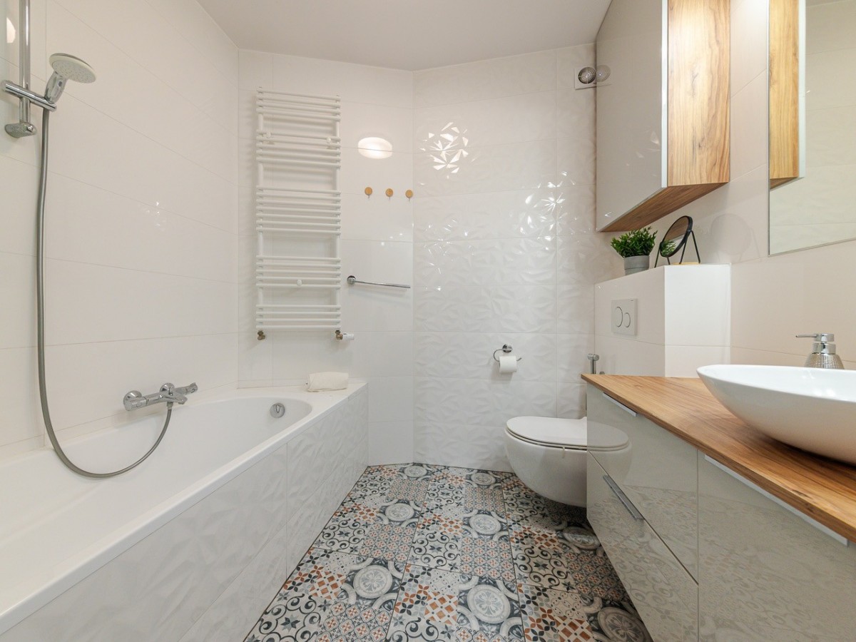 Łazienka wykończona w nowoczesnym stylu.