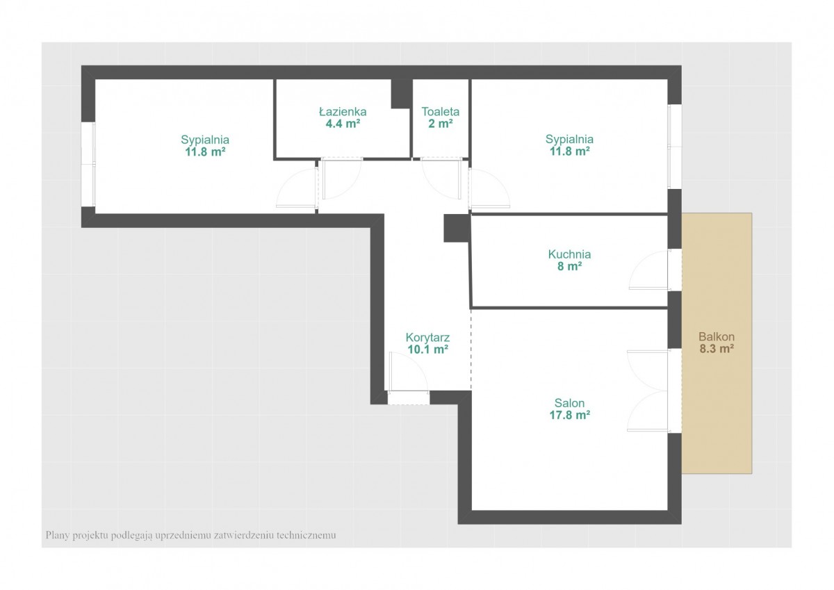 Mieszkanie o powierzchni całkowitej 66 m2 składa się z: