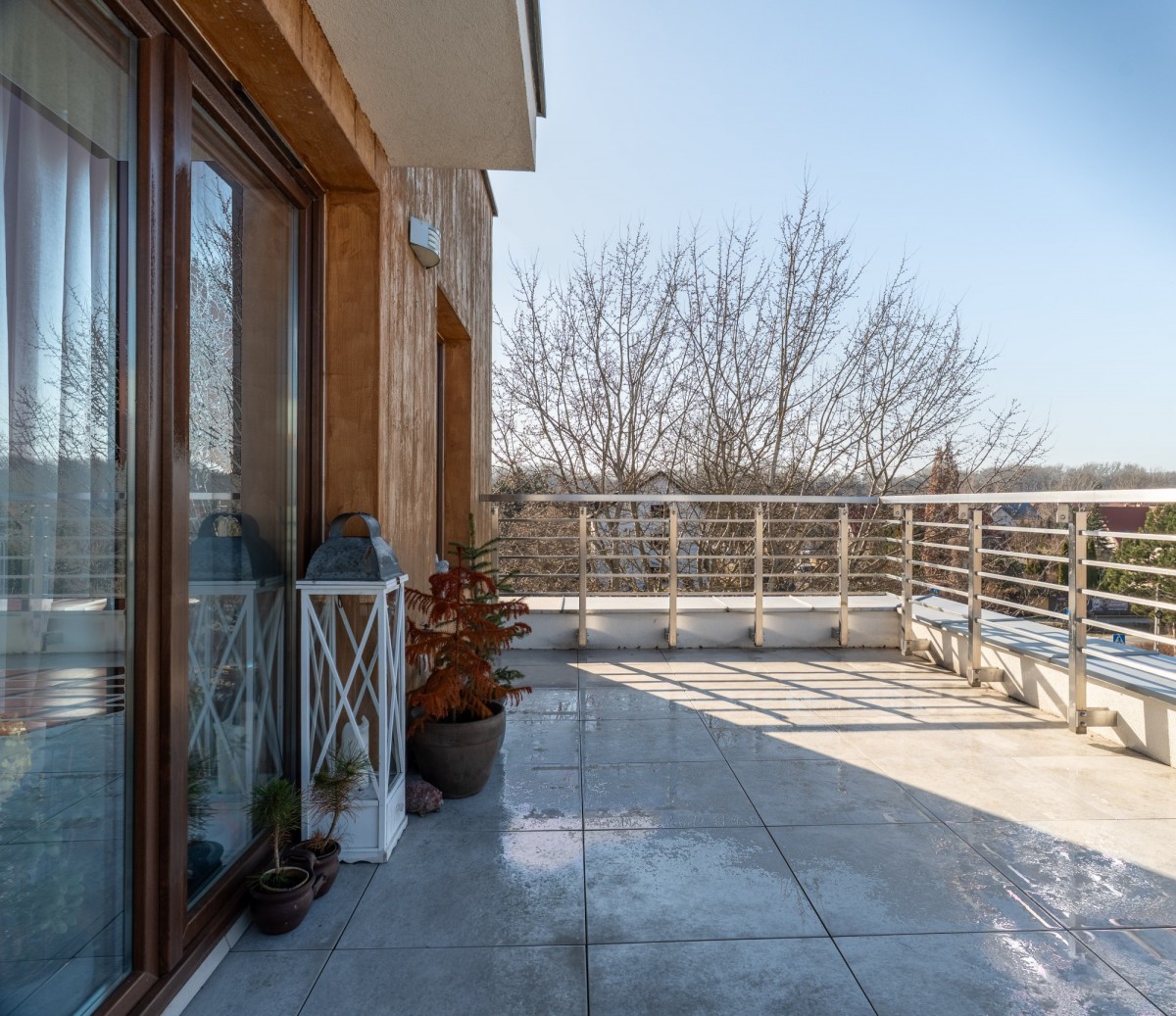 Z salonu prowadzi wyjście na przestronny taras o powierzchni 17,16 m², skierowany na stronę zachodnią, co zapewnia dużo naturalnego światła i przyjemne popołudniowe słońce.