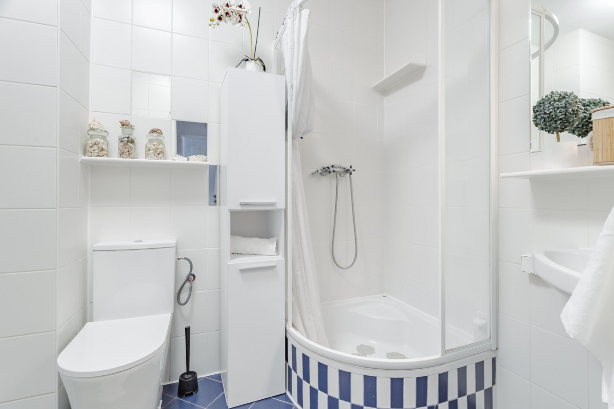 – łazienka z prysznicem, WC, umywalką oraz pralką i suszarką,