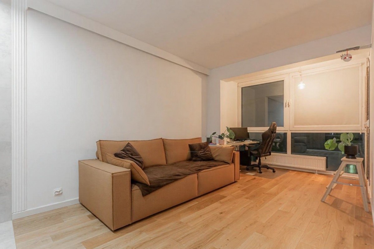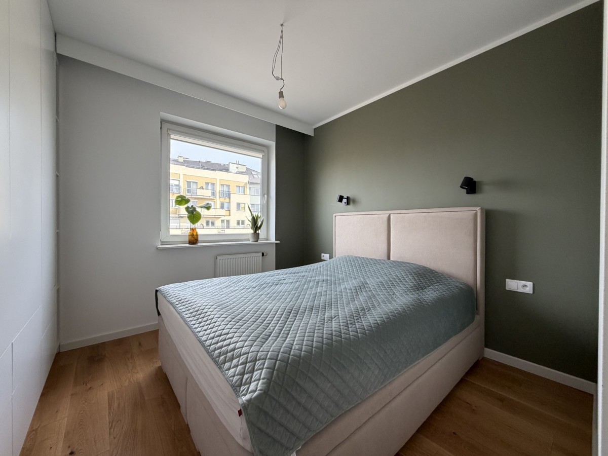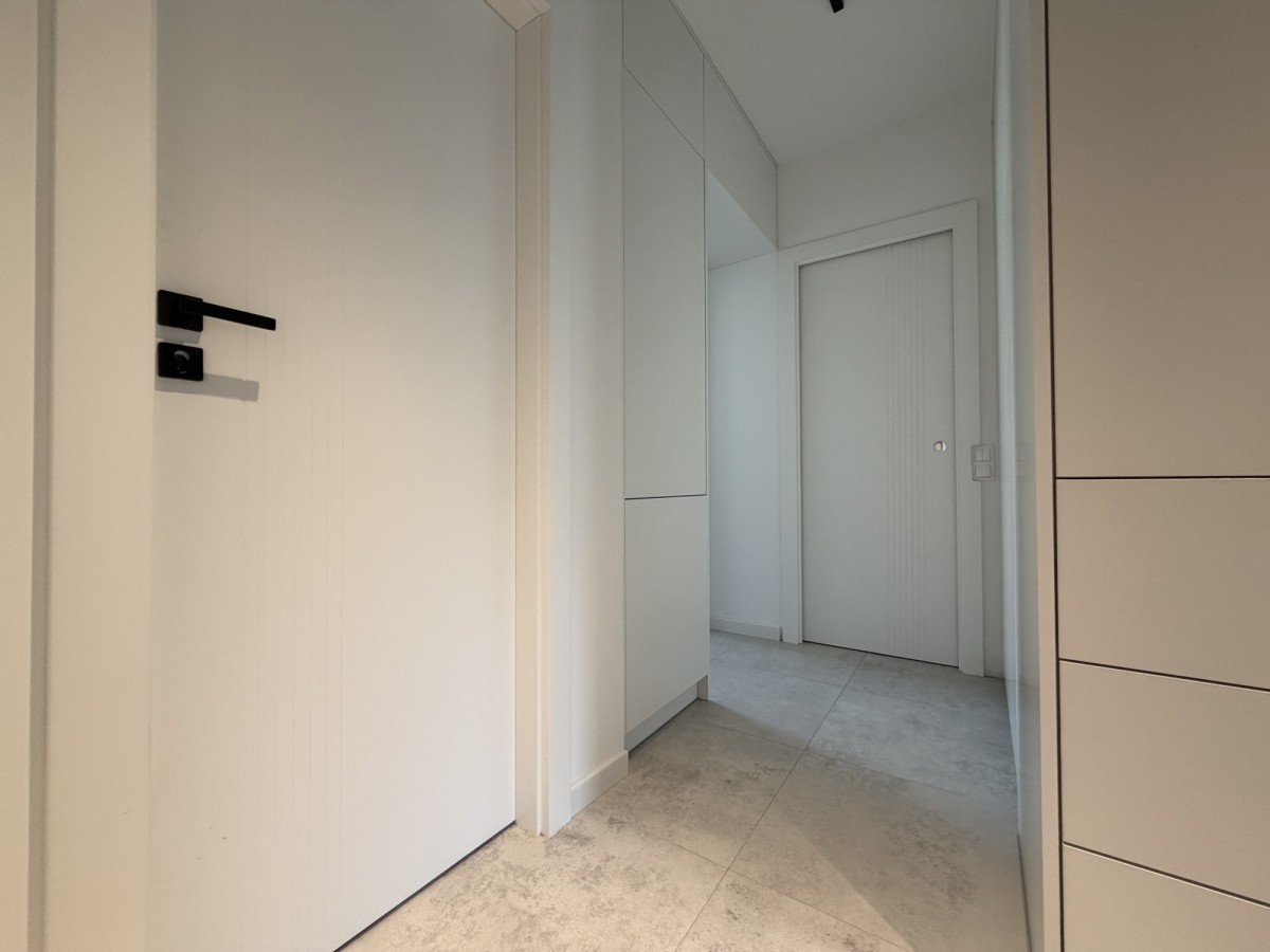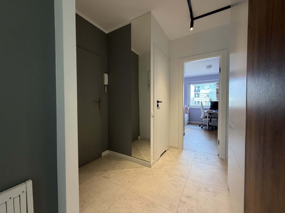 Mieszkanie przeszło generalny remont w 2024 roku – wymieniono instalacje wodno-kanalizacyjne i elektryczne, wykonano nowe podłogi, gładzie oraz zabudowy stolarskie na wymiar. Projekt został przygotowany we współpracy z architektem.