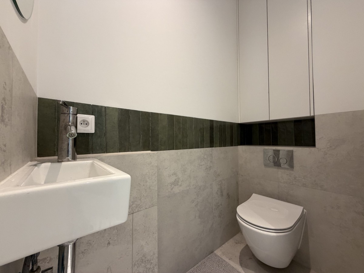 Osobne WC – WC w zabudowie, mała umywalka i dodatkowe szafki.