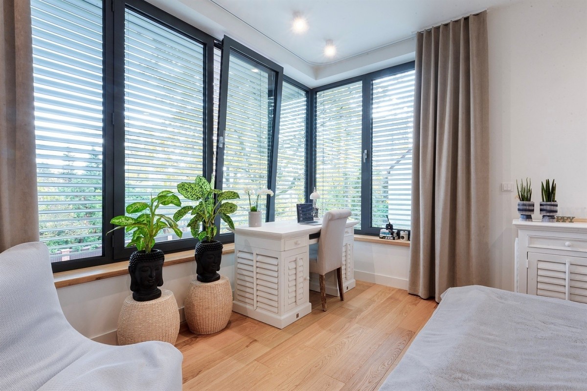 Układ pokoi bardzo funkcjonalny i elastyczny z możliwością zaaranżowania 5 sypialni oraz wygospodarowania dodatkowego gabinetu do pracy zdalnej. Aranżacja typowa dla nowoczesnych rozwiązań architektonicznych: