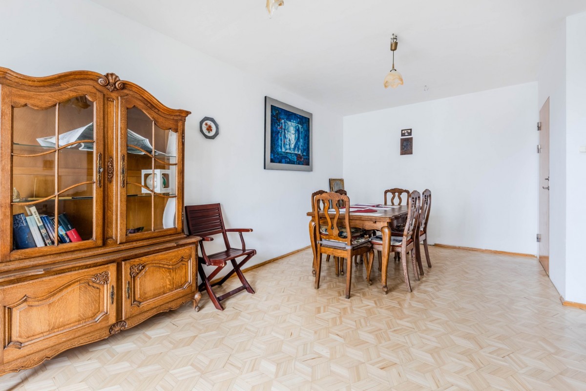 Mieszkanie z potencjałem na pierwszym pietrze w niskim 3 piętrowym budynku. Szerokie klatki schodowe. Powierzchnia ma 110 mkw, mieszkanie bezprogowe, podłoga parkiet złoty jesion, modrzewiowe okna. Mieszkanie składa się z 5 pokoi, w tym duży salon z balkonem, 4 sypialnie – jedna bardzo duża z balkonem, 2 garderoby, osobna kuchnia z oknem i spiżarnią, duża łazienka z wanną, druga łazienka z prysznicem. Do mieszkania przynależą 2 miejsca parkingowe – każde po 11.5 mkw w podziemnym garażu oraz komórka lokatorska 7 mkw – dwa garaże i komórka lokatorska w cenie 110 tys. zł