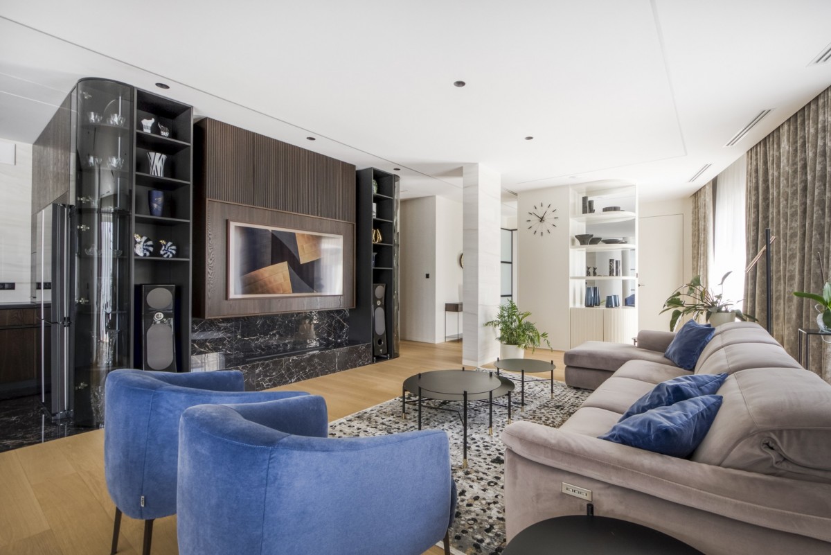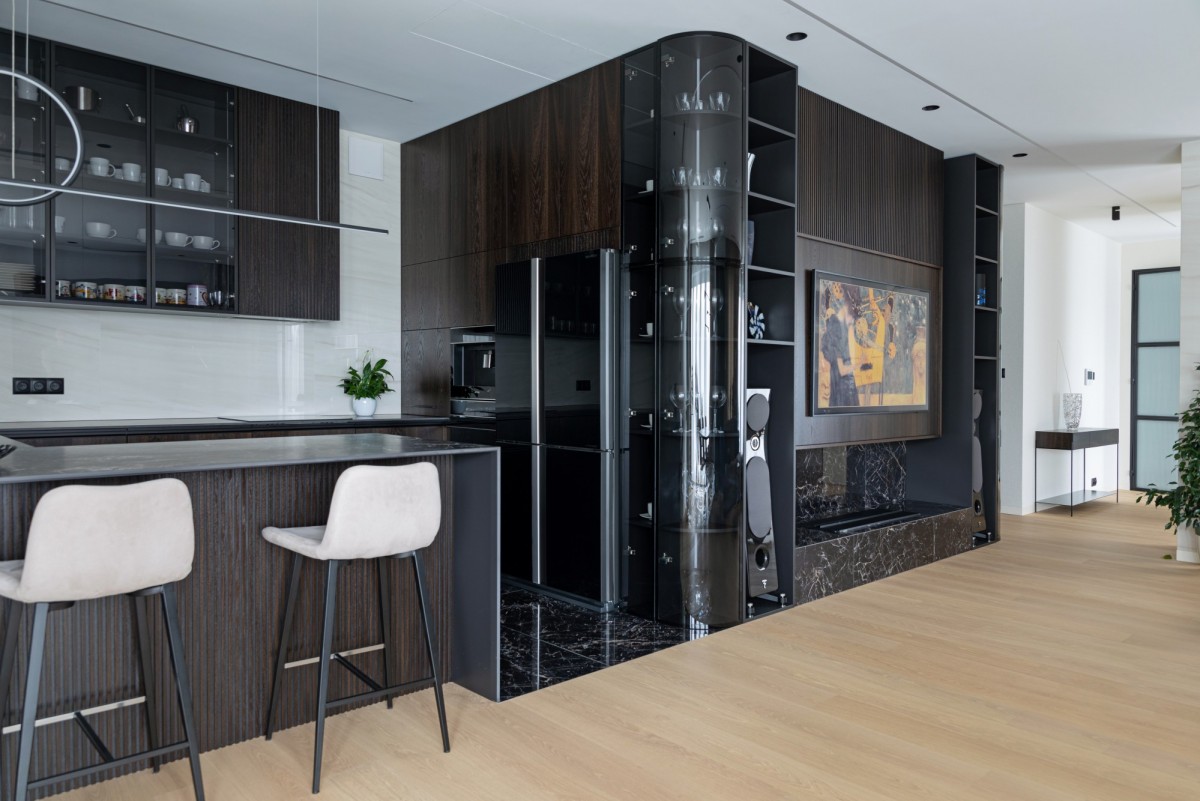 Kuchnia – meble fornirowane, blat ze spieków oraz wysokiej klasy sprzęt AGD (Smeg, lodówka french door Sharp, dwustrefowa winiarka Vestfrost).