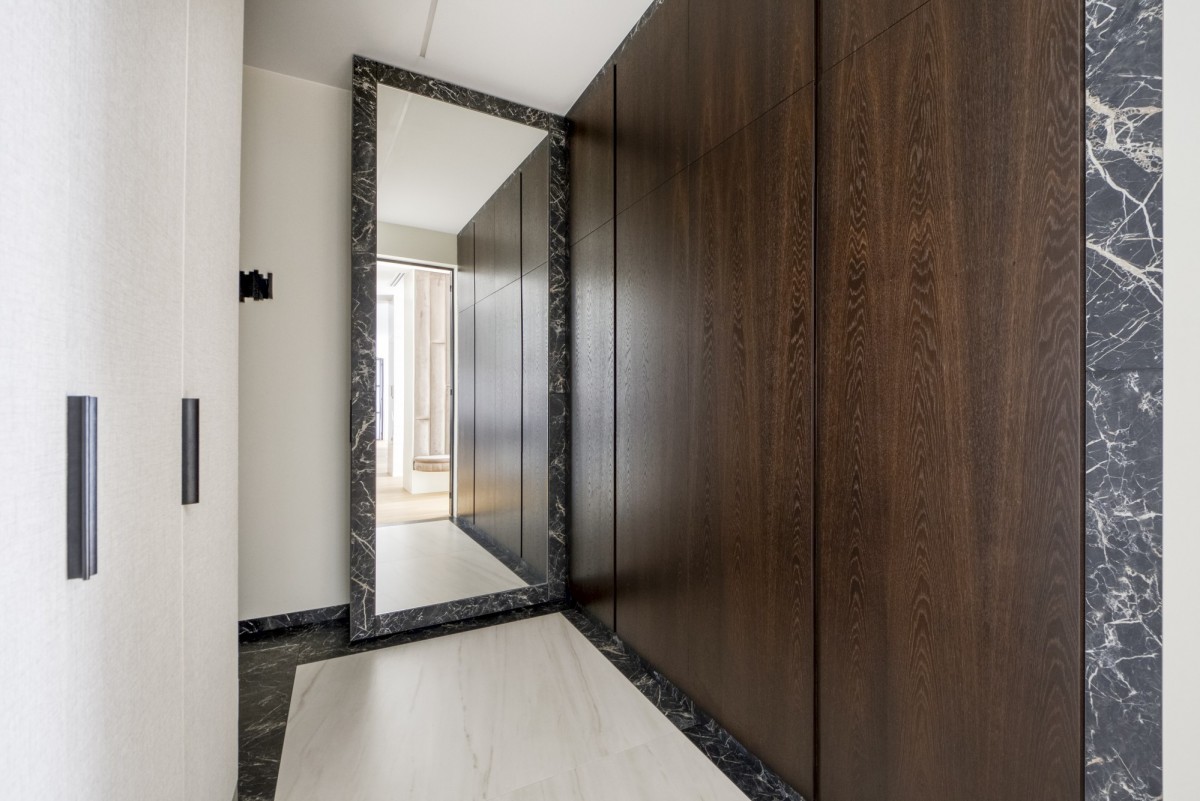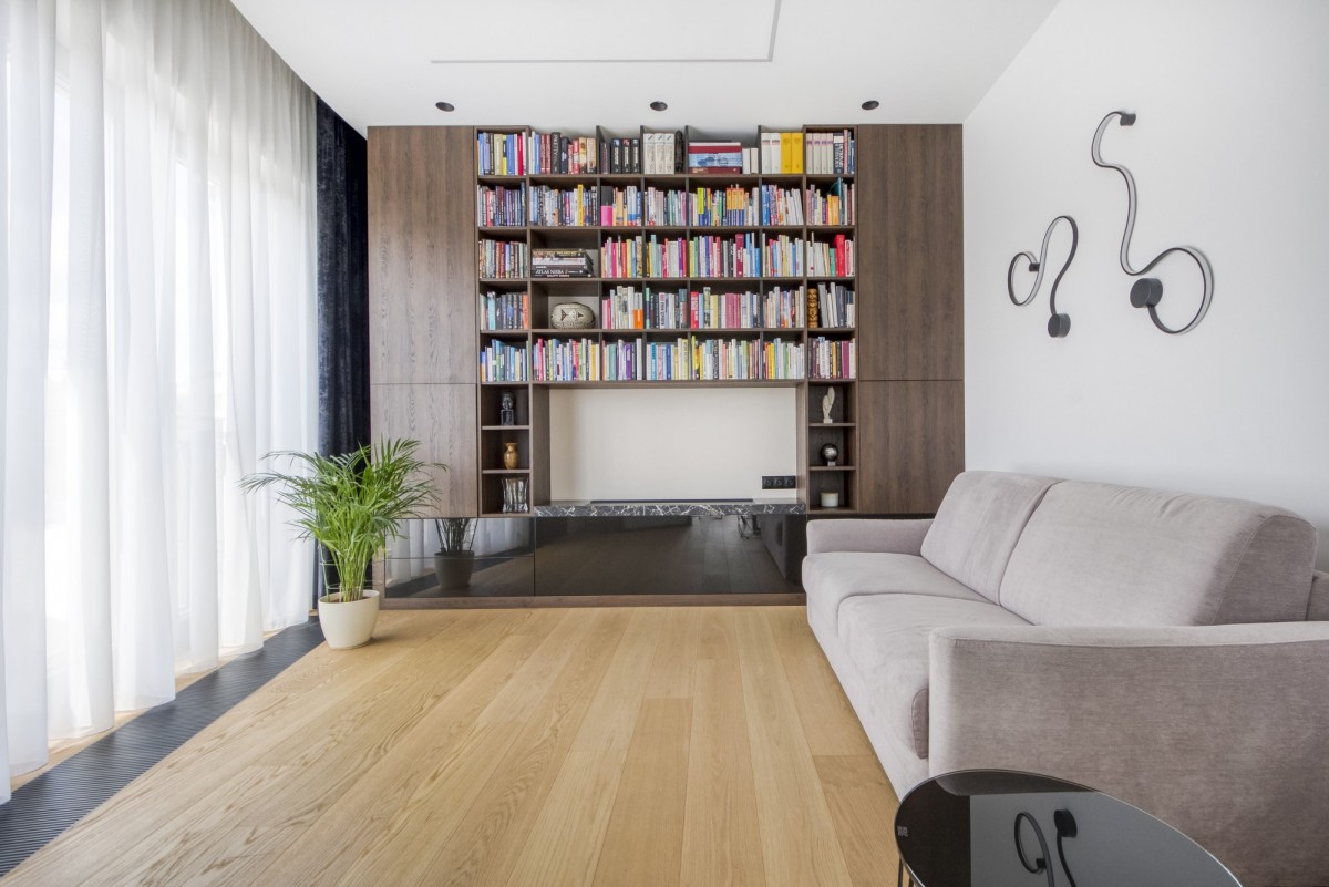 Wykończenie materiałami wysokiej jakości: deski dębowe olejowane, płytki Marazzi, tapety Versace, meble fornirowane, drzwi ukryte.
