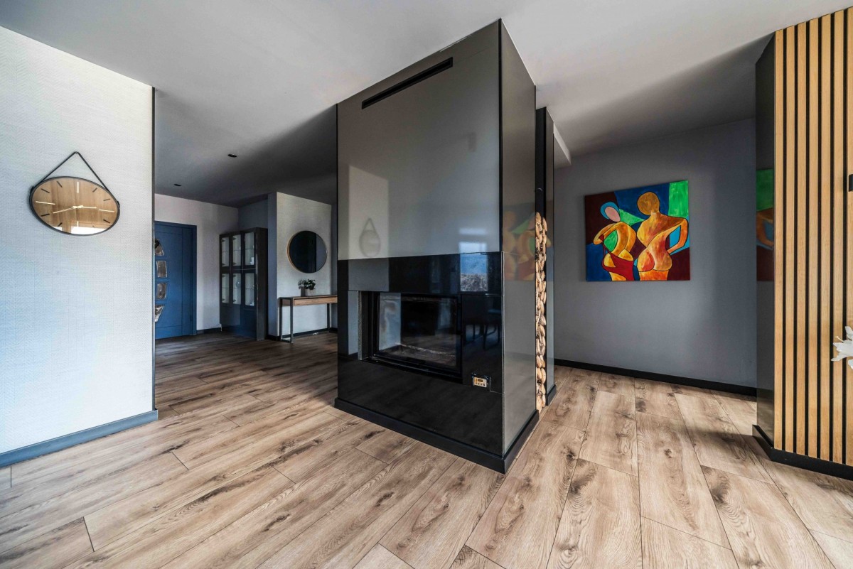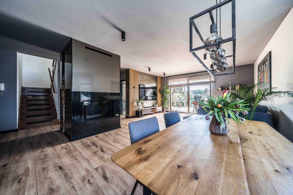 Dom zaprojektowany z myślą o wygodzie – wyraźny podział na strefę dzienną i prywatną, dużo światła oraz funkcjonalny układ pomieszczeń.