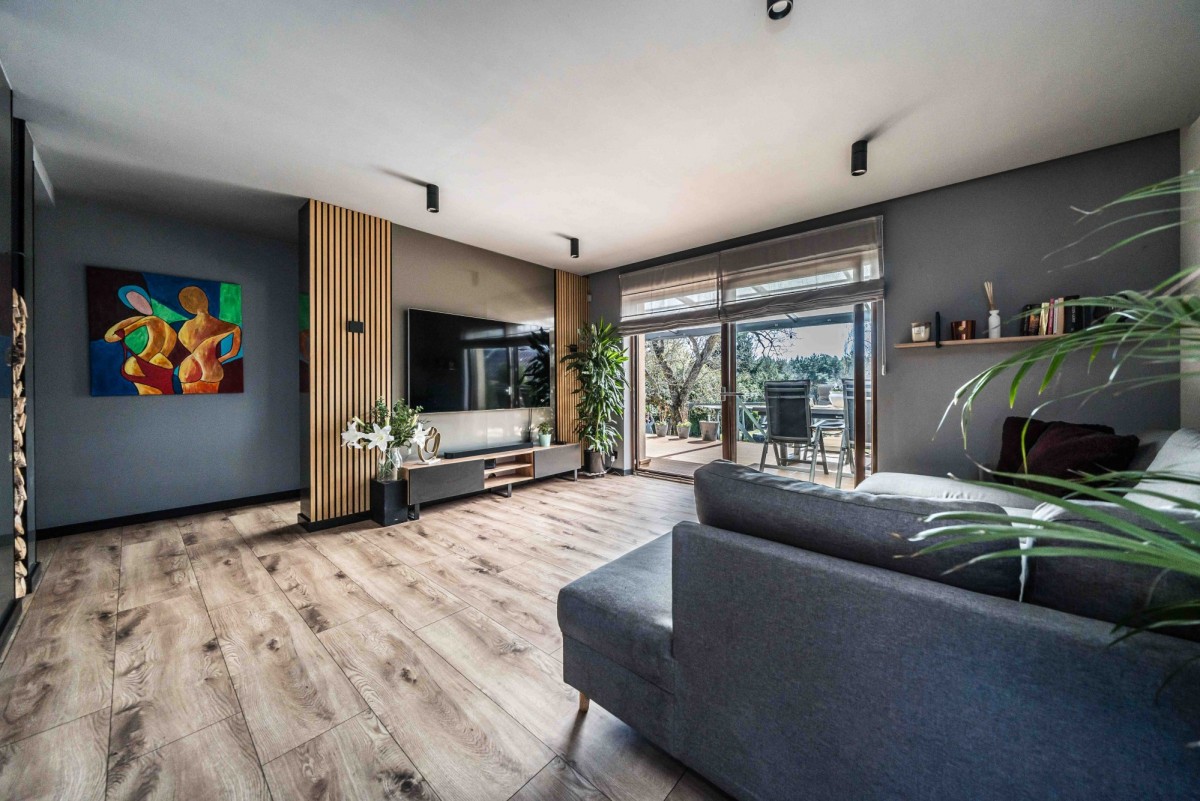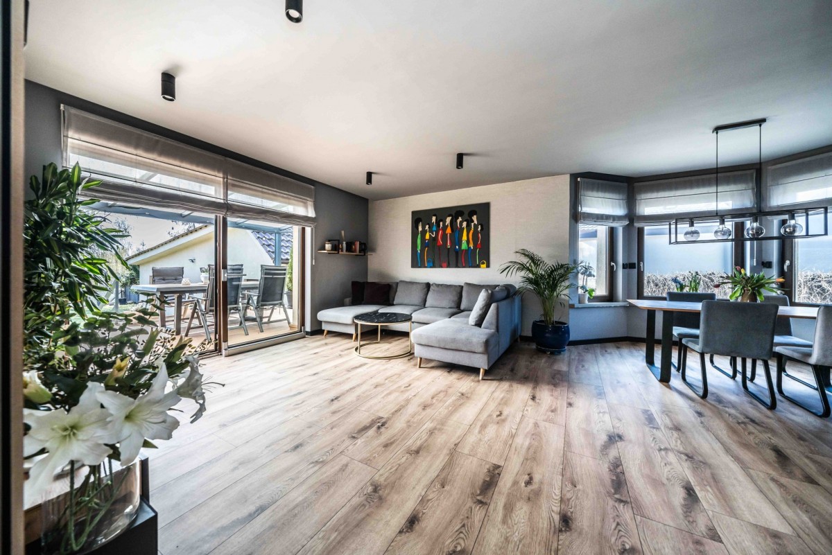 przestronny, jasny salon z aneksem kuchennym i wyjściem na taras oraz ogród