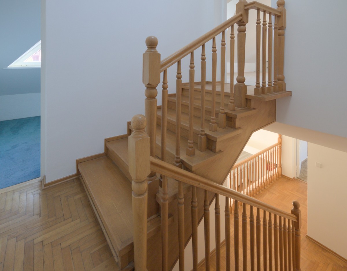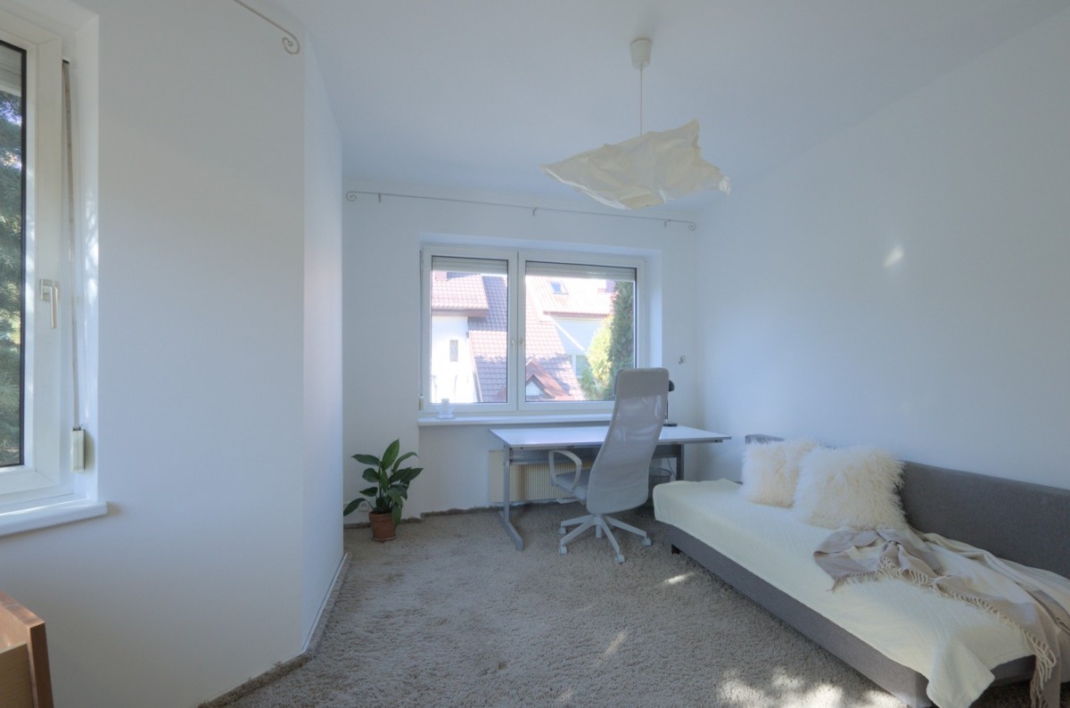 Powyżej salonu znajdują się 2 sypialnie – jedna z szafą w zabudowie, druga z obszerną garderobą oraz dodatkowy pokój, który może służyć np. jako gabinet lub pokój dziecka. Na tym poziomie również duża łazienka z wanną.