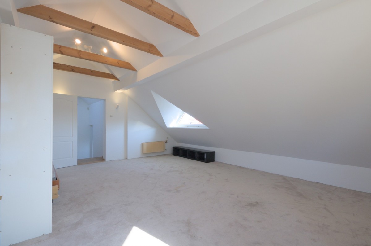 Powyżej – otwarta przestrzeń poddasza użytkowego daje możliwość własnej aranżacji. W zależności od potrzeb może stanowić zarówno pracownię, bibliotekę, salę fitness, wymarzone miejsce zabaw dla dzieci, pokój rekreacyjny czy prywatną salę kinową.