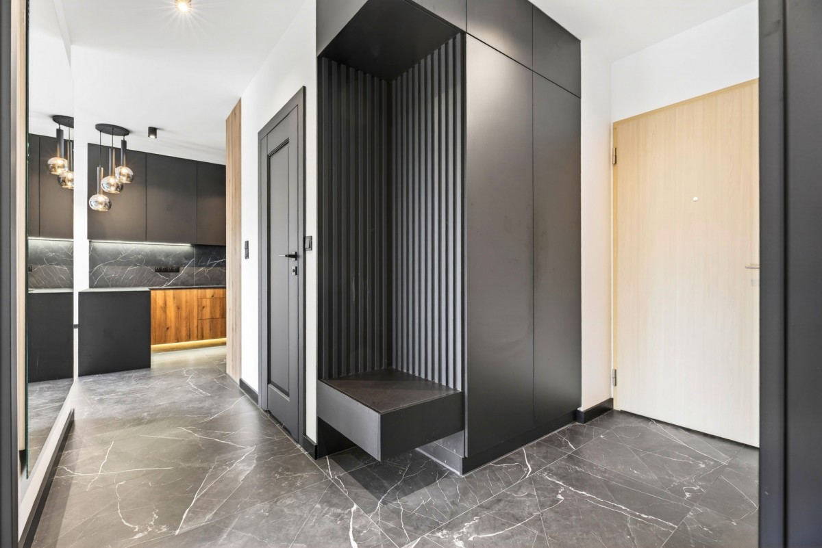 Wnętrze zaprojektowano w nowoczesnym, minimalistycznym stylu premium. Dominują tu kontrasty naturalnego drewna, czerni oraz jasnych, neutralnych powierzchni.