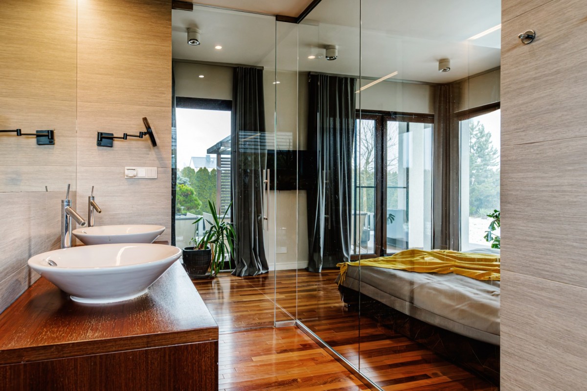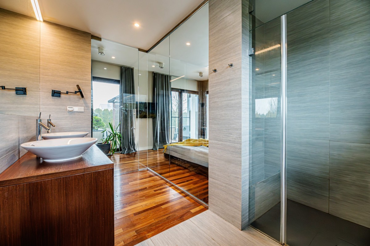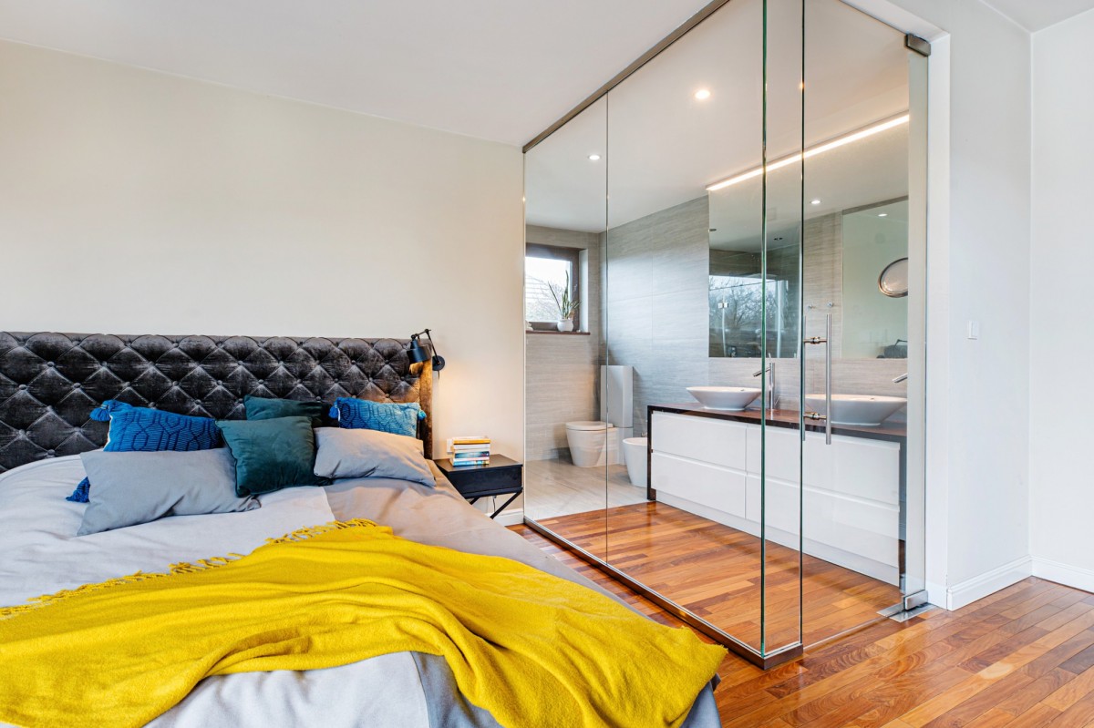 Dom oferuje przestronną część dzienną z możliwością połączenia salonu z jadalnią i kuchnią, liczne sypialnie, łazienki oraz pomieszczenia techniczne i gospodarcze. Duże przeszklenia zapewniają doskonałe doświetlenie wnętrz i kontakt z ogrodem.