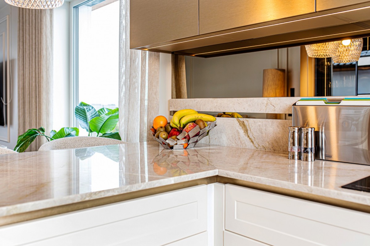 Salon z jadalnią 27,80 m² połączony z nowoczesną kuchnią 8,60 m² i praktyczną spiżarnią 2,21 m².