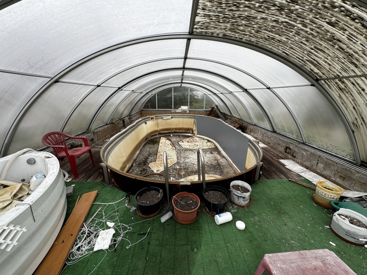 Ogród w foremnym kształcie jest regularnie pielęgnowany i dopieszczany, teraz z upływem lat już nieco zarośnięty i wymagający pracy. Na działce znajduje się również zadaszony basen, olbrzymi garaż dla auto ciężarowych, biuro oraz pomieszczenia gospodarcze z dodatkową toaletą.