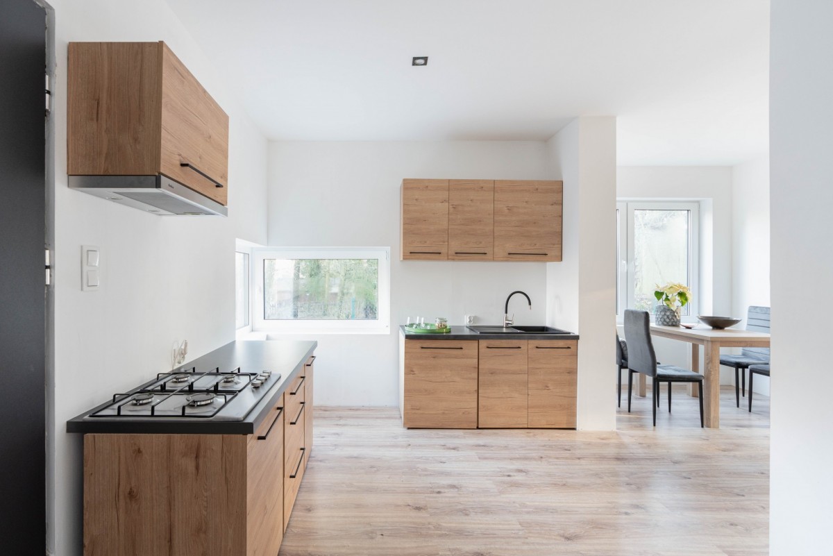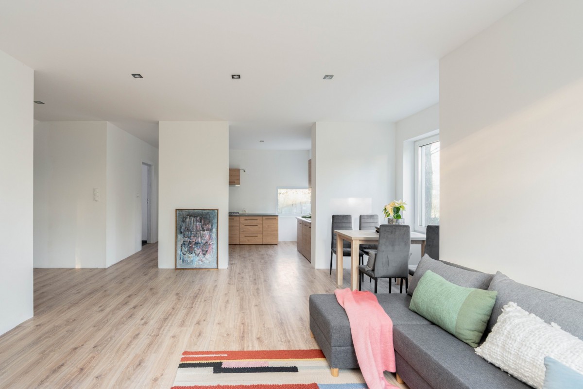 • Przestronny salon z aneksem kuchennym — idealne miejsce do wspólnego spędzania czasu, z naturalnym światłem wpadającym z ogrodu