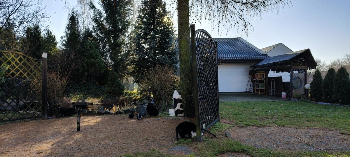 Działka o powierzchni 1617m2,ogrodzona; z frontu o szerokości 23m ze kutej stali na podmurówce i słupkach brama przesuwna sterowana pilotem, na dwóch dłuższych bokach oraz z tyłu wykonano ogrodzenie z siatki,