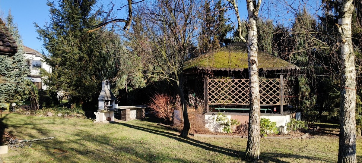 Działka w całości zagospodarowana; liczne ciekawe nasadzenia. Rośliny tak dobrane, że od wczesnej wiosny aż do zimy ogród kwitnie, pachnie i cieszy kolorami domowników oraz zachwyca wszystkich gości. Trawnik, miejsce na basen sezonowy; Część rekreacyjna (około 1.000m2) od strony południowo zachodniej znajduje się na tyłach nieruchomości zapewniając komfort wypoczynku. Nieruchomość graniczy tylko z dwoma sąsiadami!!!
