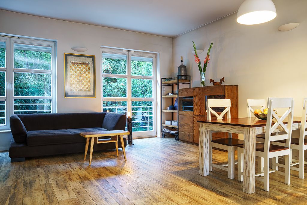 W salonie i kuchni wysokie dwuskrzydłowe okna wprowadzające do wnętrza dużo światła.