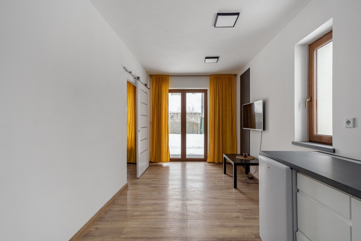 Z salonu wyjście na taras o powierzchni ok. 10 m², z którego prowadzi furtka do prywatnego ogrodu – idealnego miejsca do wypoczynku, pracy zdalnej lub spędzania czasu z rodziną.