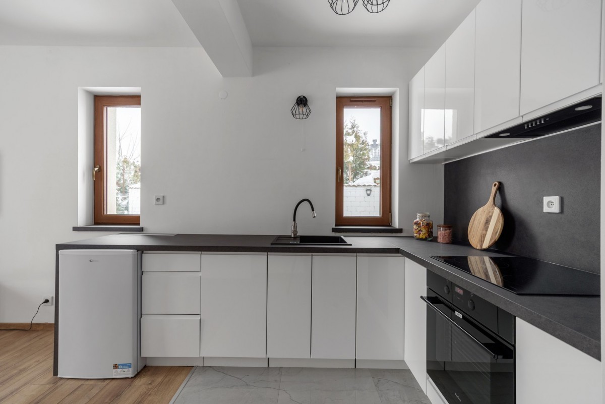 Czteromieszkaniowy dom w formie bliźniaka, zaprojektowany w harmonii z otoczeniem. Architektura nawiązuje do klasycznych, śródmiejskich kamieniczek – elewacja o trzech fakturach, okna ze szprosami, bardzo dobre proporcje bryły.