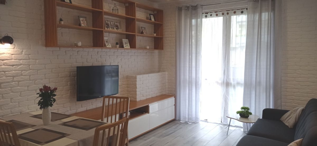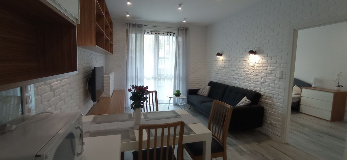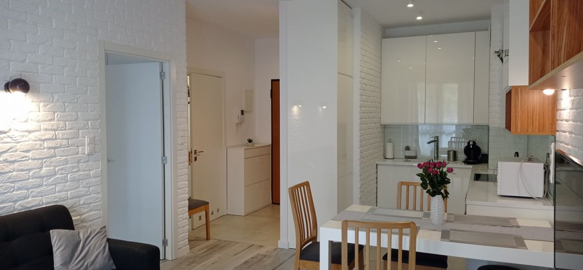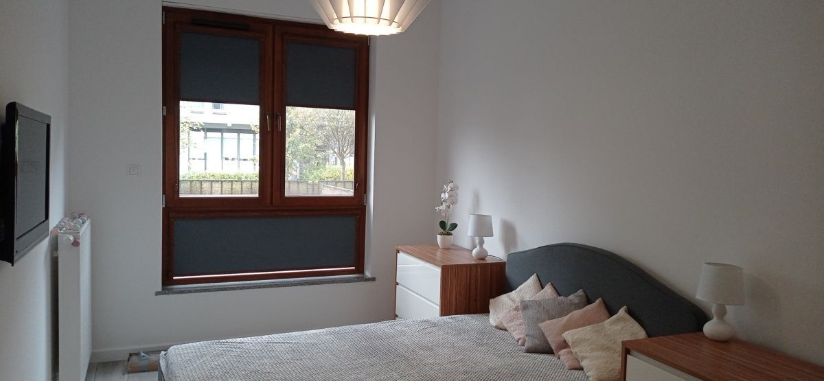Do wynajęcia słoneczne, przestronne, dwupokojowe mieszkanie o powierzchni 43,4 m2, położne na parterze w apartamentowcu z 2013 roku w miasteczku Wilanów.