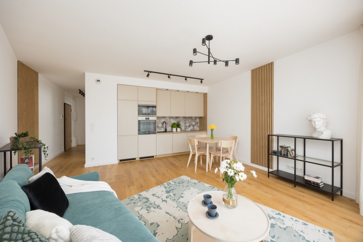 To funkcjonalne mieszkanie z dodatkowym poziomem użytkowym znajduje się w budynku z 2007 roku na poznańskim Strzeszynie – miejscu, które łączy wygodę życia w mieście z bliskością natury.
