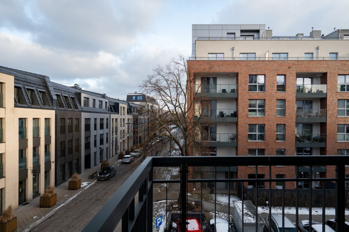* Balkon / taras (10 m²) z bocznym widokiem na zabudowę Starego Miasta i osiedle – idealne miejsce na poranną kawę.