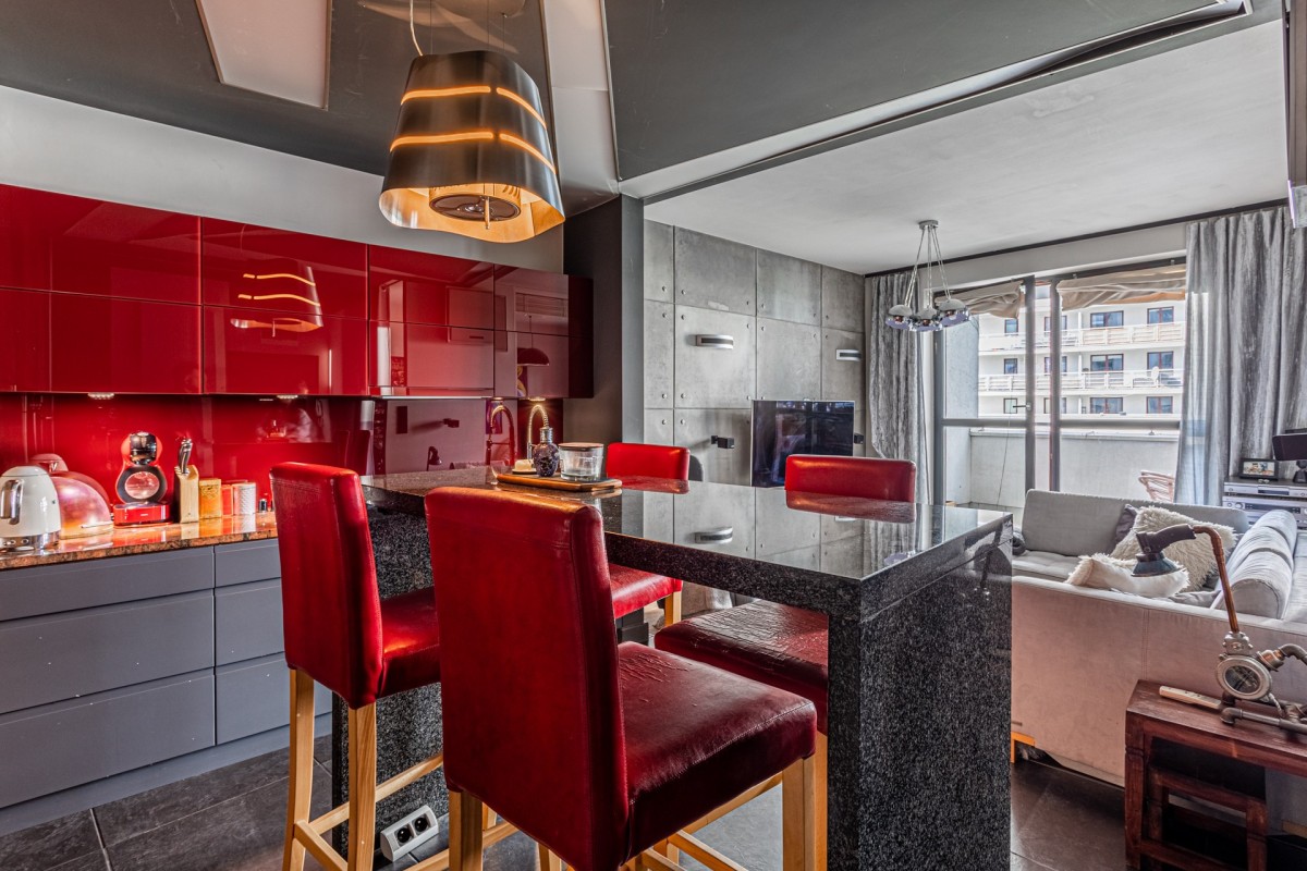 Podłogi z drewna egzotycznego, w łazience trawertyn, zabudowy z forniru. Zmontowana instalacja ogrzewania podłogowego, dla komfortu mieszkania zainstalowano również klimatyzację. Wysokiej klasy sprzęt audio – nagłośnienie BOSE, oraz sprzęty kuchenne AGD (Miele, Bosch, Dyson, Elica, SMEG).