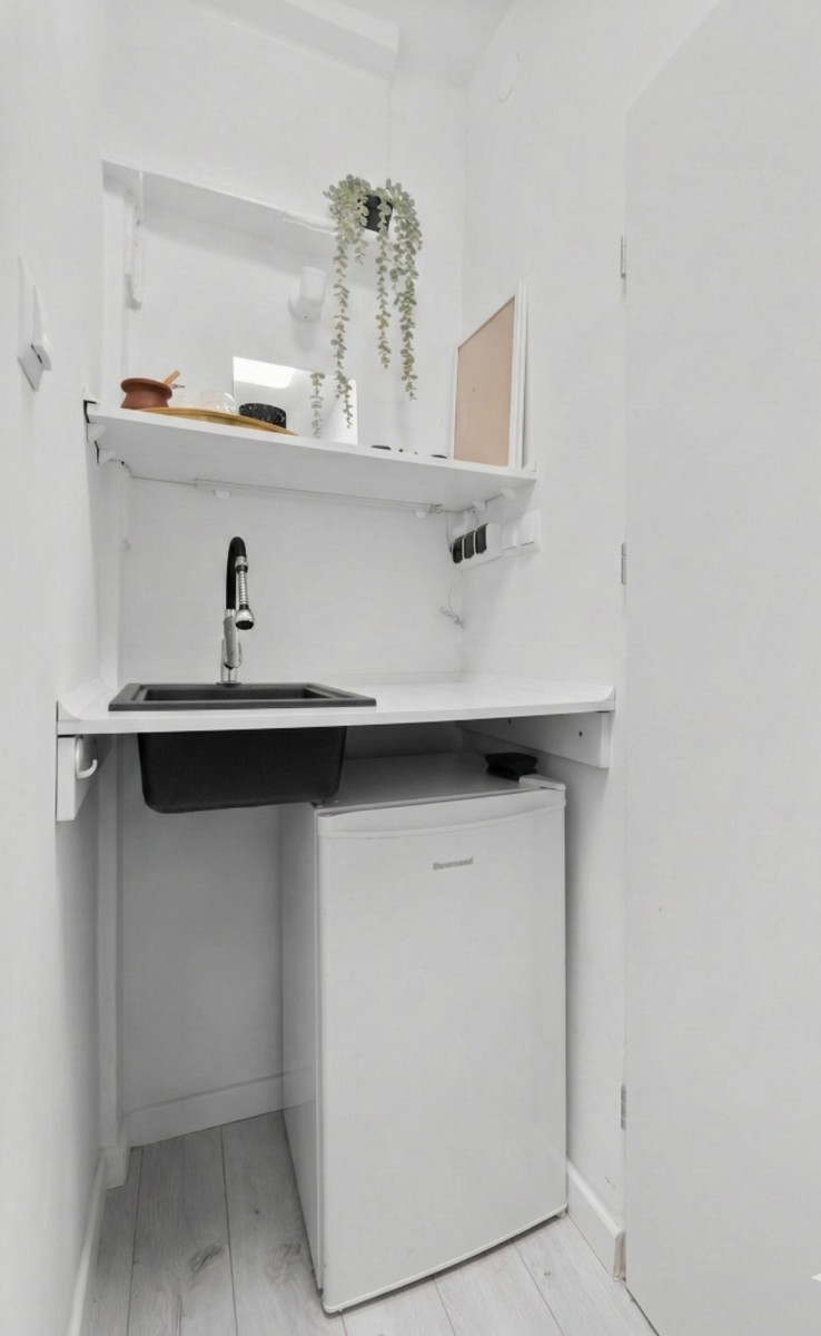 Układ: otwarta przestrzeń z aneksem, zaaranżowana jako samowystarczalna mikrokawalerka. Wnętrze jest jasne, ustawne i maksymalnie wykorzystuje dostępny metraż.