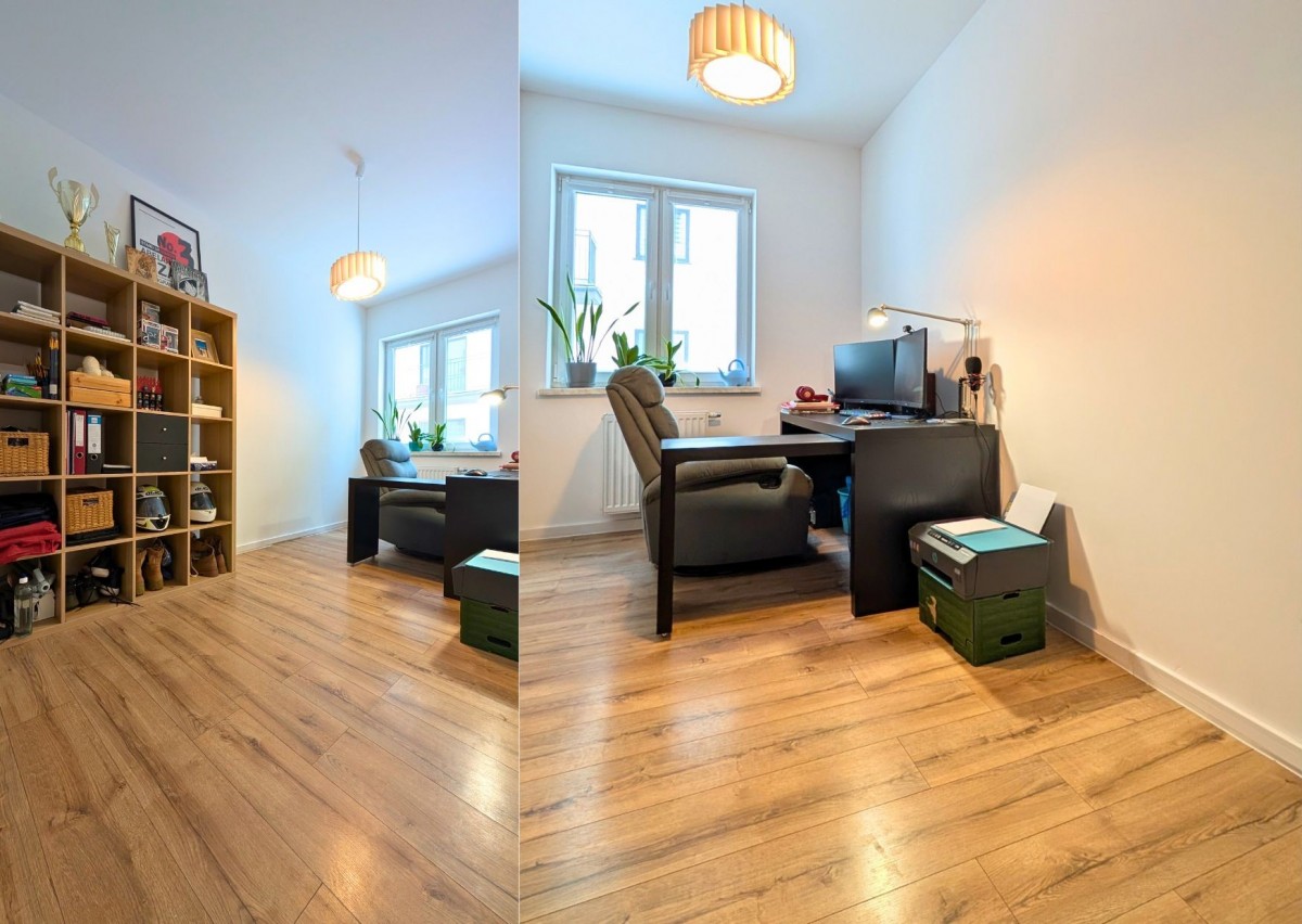 W cenie mieszkania pozostaje w pełni wyposażona kuchnia: sprzęt w zabudowie (zmywarka, płyta indukcyjna, piekarnik) oraz wolnostojąca lodówka z dyspenserem zimnej wody. W łazience pralka. W sypialni szafa. W gabinecie regał.