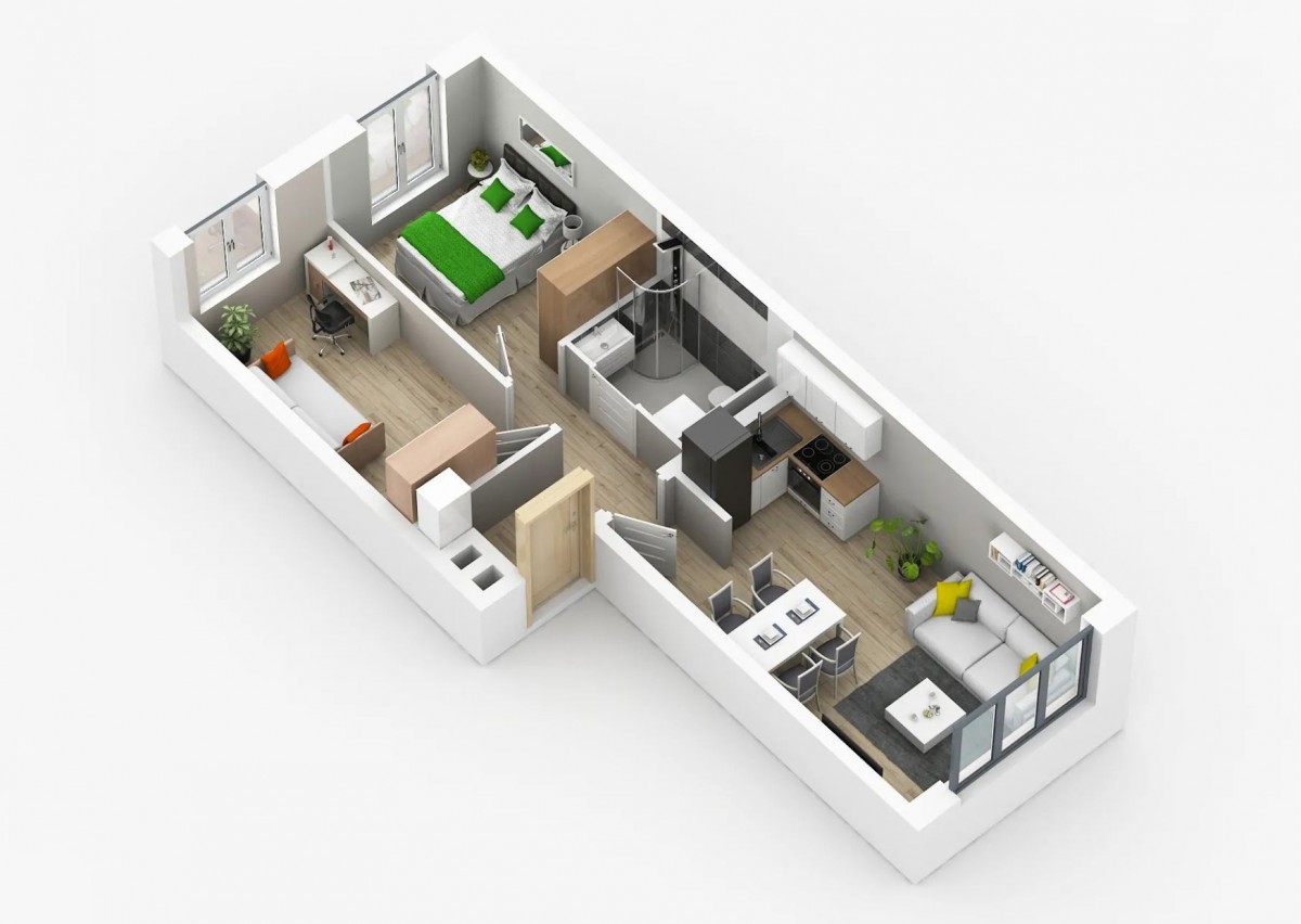 Liczba pokoi: 3 pokoje (salon z aneksem kuchennym 16,14 m2, pokój 8,35m2 , pokój 9,57m2, łazienka 2,93 m2, korytarz 4,31m2)