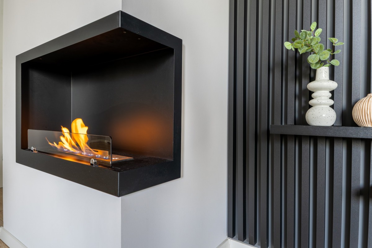 The rising sun gently brightens the living room. Coffee is brewing in the kitchen, and you step out onto the loggia, looking over the green patio that is still asleep. It’s quiet and peaceful – exactly how you like it. You return inside, where a spacious living room with a bio-fireplace welcomes you with warmth. This is where daily conversations unfold, shared dinners take place, movie nights happen, and weekend breakfasts linger. Open to the living room, the custom-built kitchen with an island is elegant, functional, and fully equipped. Nothing needs to be changed – the space forms a cohesive and complete whole.