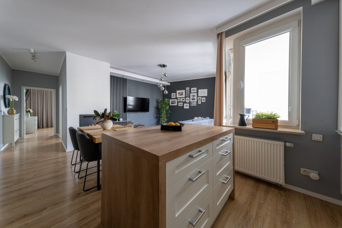 Wschodzące słońce delikatnie rozświetla salon. W kuchni parzy się kawa, a Ty wychodzisz na loggię, spoglądając na zielone patio, które jeszcze śpi. Jest cicho, spokojnie, dokładnie tak, jak lubisz. Wracasz do środka, gdzie ciepłem wita Cię przestronny salon z biokominkiem. To tutaj toczą się codzienne rozmowy, wspólne kolacje, wieczory z filmem czy weekendowe śniadania. Otwarta na salon, wykonana na wymiar kuchnia z wyspą jest elegancka, funkcjonalna i świetnie wyposażona. Niczego nie trzeba zmieniać – to miejsce tworzy kompletną całość.