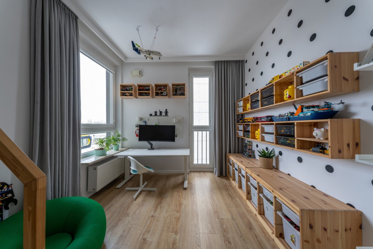 W sypialni i na przyległym do niej drugim balkonie zachwycają z kolei zachody słońca. W pokoju dziecięcym/gabinecie toczy się jeszcze inna historia. To miejsce na naukę, pracę zdalną (biurko o regulowanej wysokości), ale i odpoczynek. Łazienka z wanną i deszczownicą może zamienić zwykły wieczór w domowe SPA. Garderoba pełniąca też rolę pralni porządkuje codzienność, ale i daje możliwość stworzenia drugiej łazienki – na przyszłość, na nowe potrzeby.