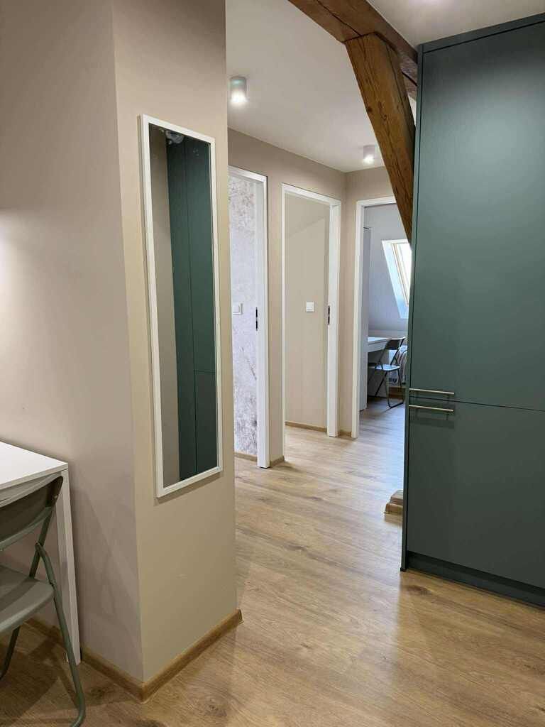 na podłogach ułożono nowe panele winylowe, ściany pomalowano i położono na niektórych ścianach efektowne tapety,
