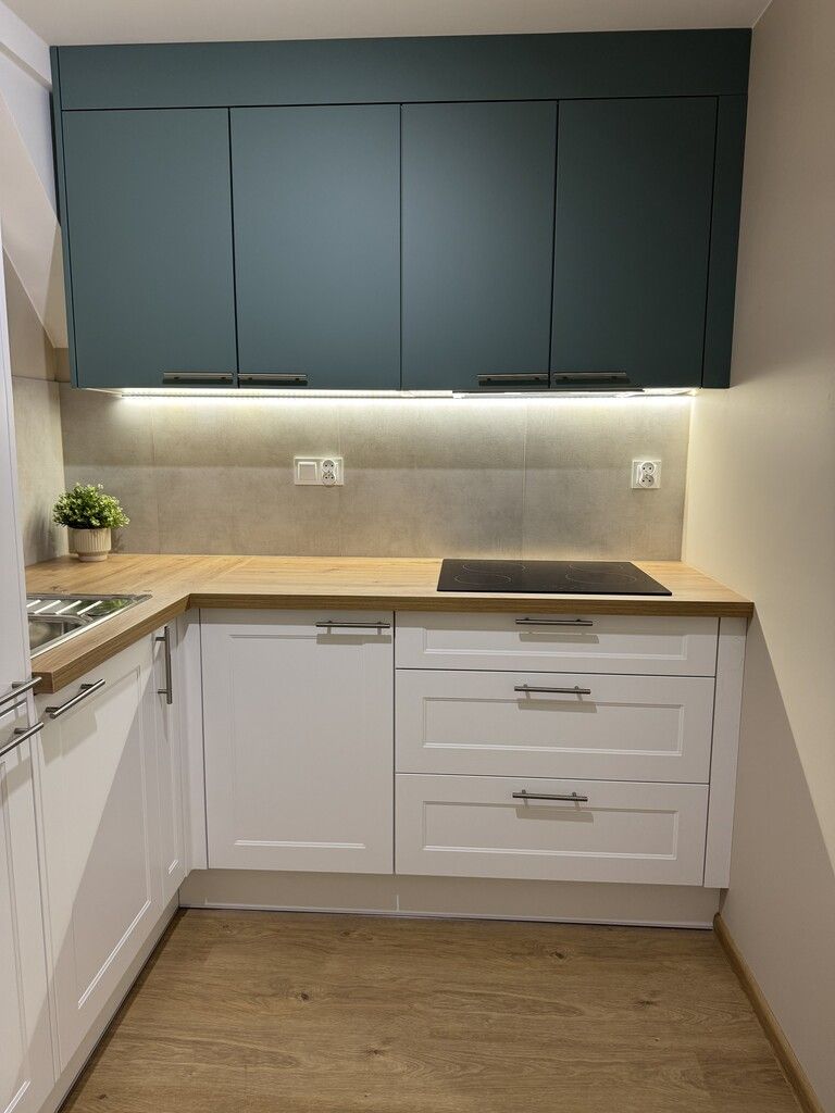 Kuchni w formie aneksu z meblami na wymiar ze sprzętem AGD (duża lodówka z zamrażarką z szufladami, kuchenka elektryczna, okap, pralka),