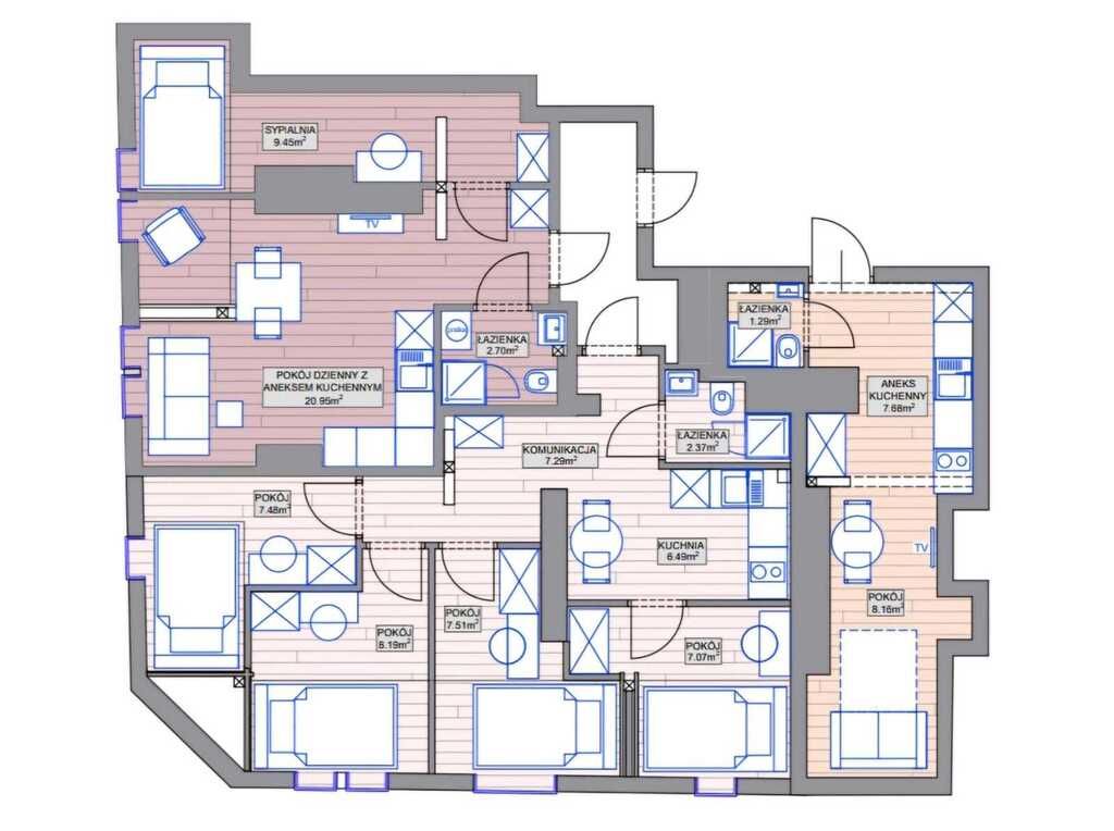 4 pokoi, każdy wyposażony w szafę, łóżko 90x200cm, biurko i krzesło.