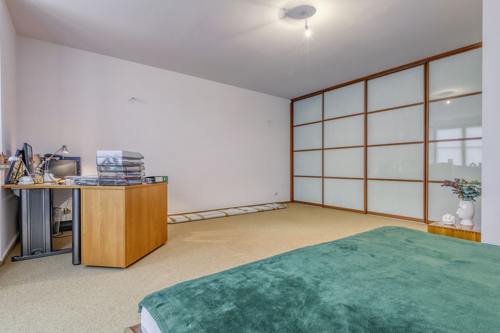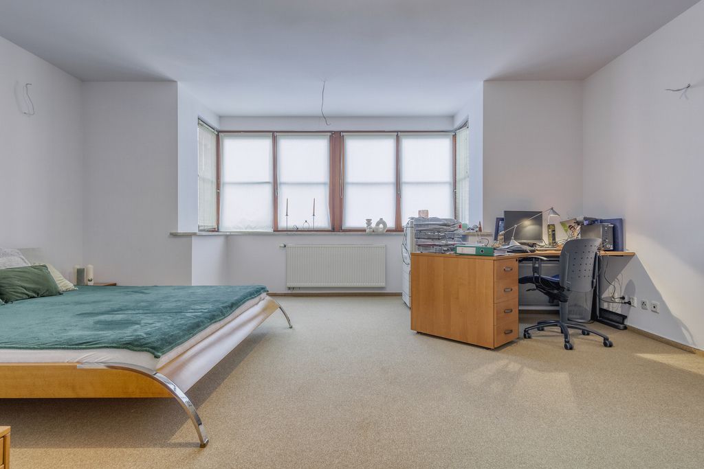 Sypialnia o powierzchni 32,28 z oszklonym wykuszem, z zabudową meblową (ogromna szafa/garderoba)
