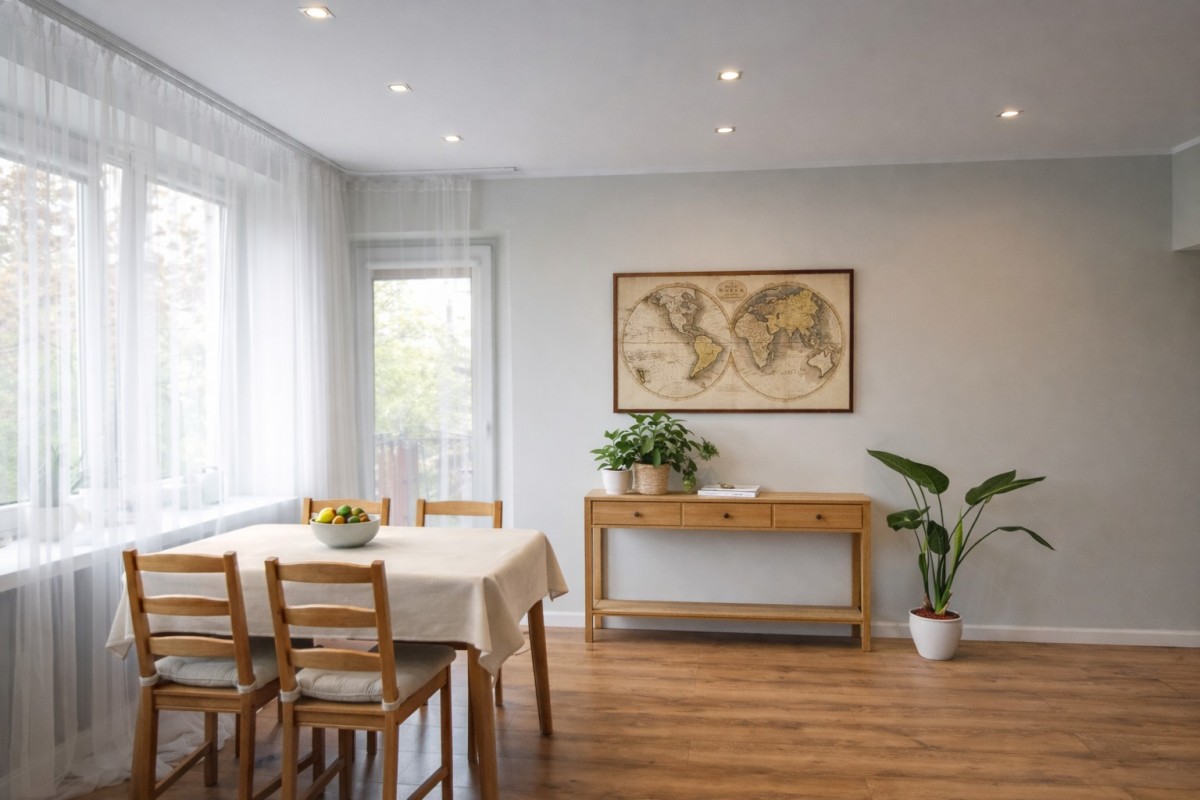 To mieszkanie ma atut, którego nie da się „doremontować”: jest bardzo ciche. Dodatkowo jest trójstronne — okna wychodzą na trzy strony świata, a za nimi jest dużo zieleni, co przekłada się na świetne doświetlenie, przewiewność i komfort na co dzień. Do lokalu przynależy również przestronna piwnica.
