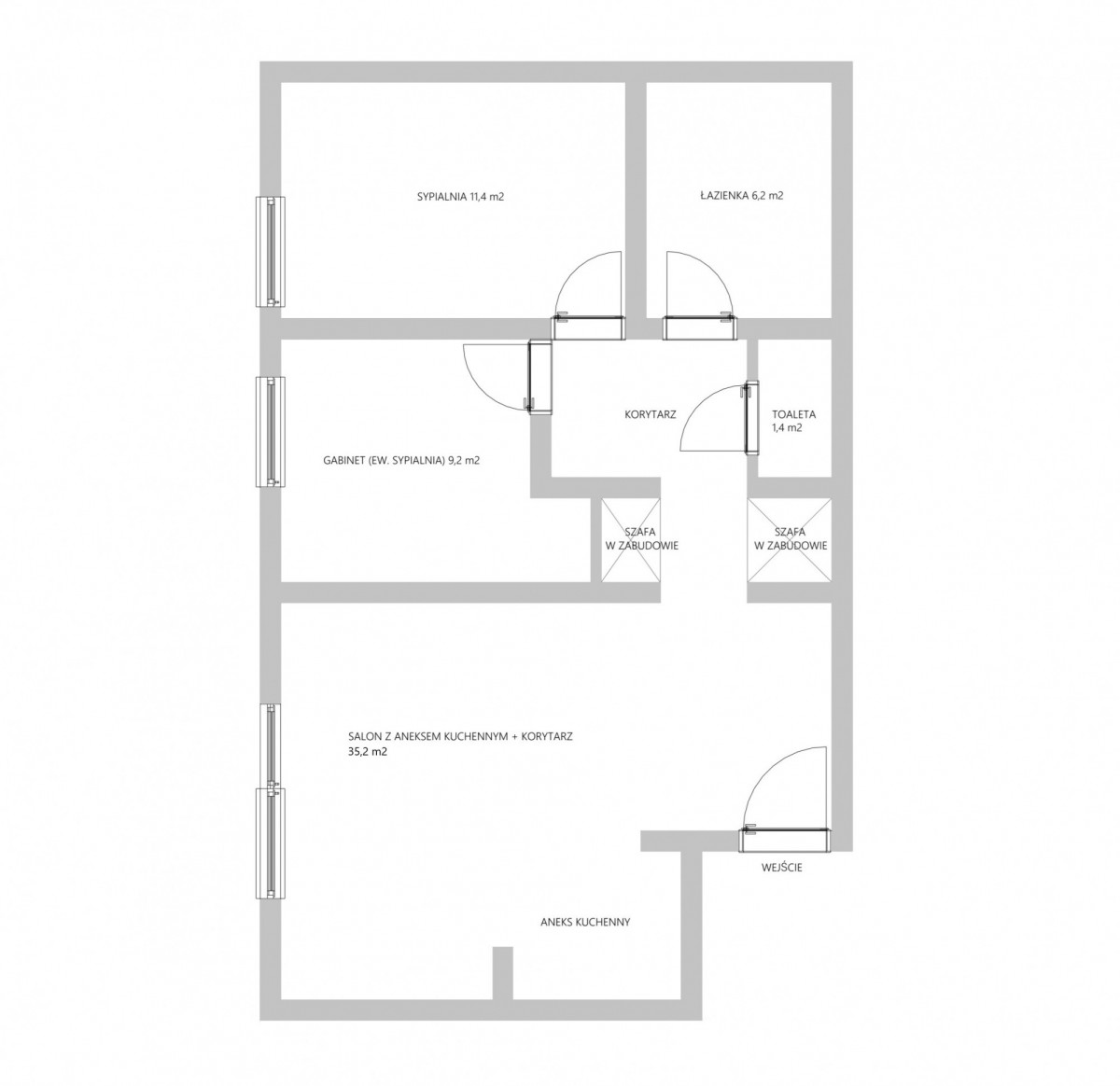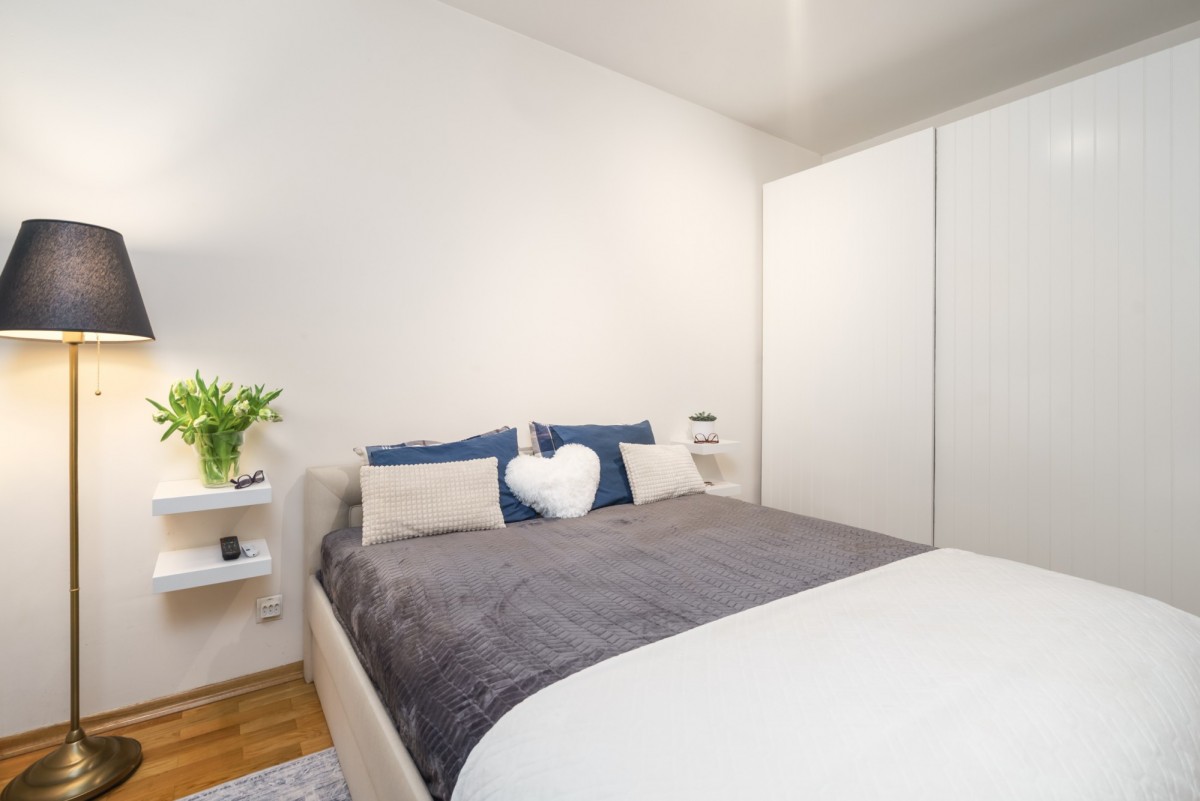 - 2 oddzielne pokoje [11,4 mkw i 9,2 mkw]- aktualnie sypialnia oraz gabinet (obie przestrzenie mogą pełnić funkcję sypialni)