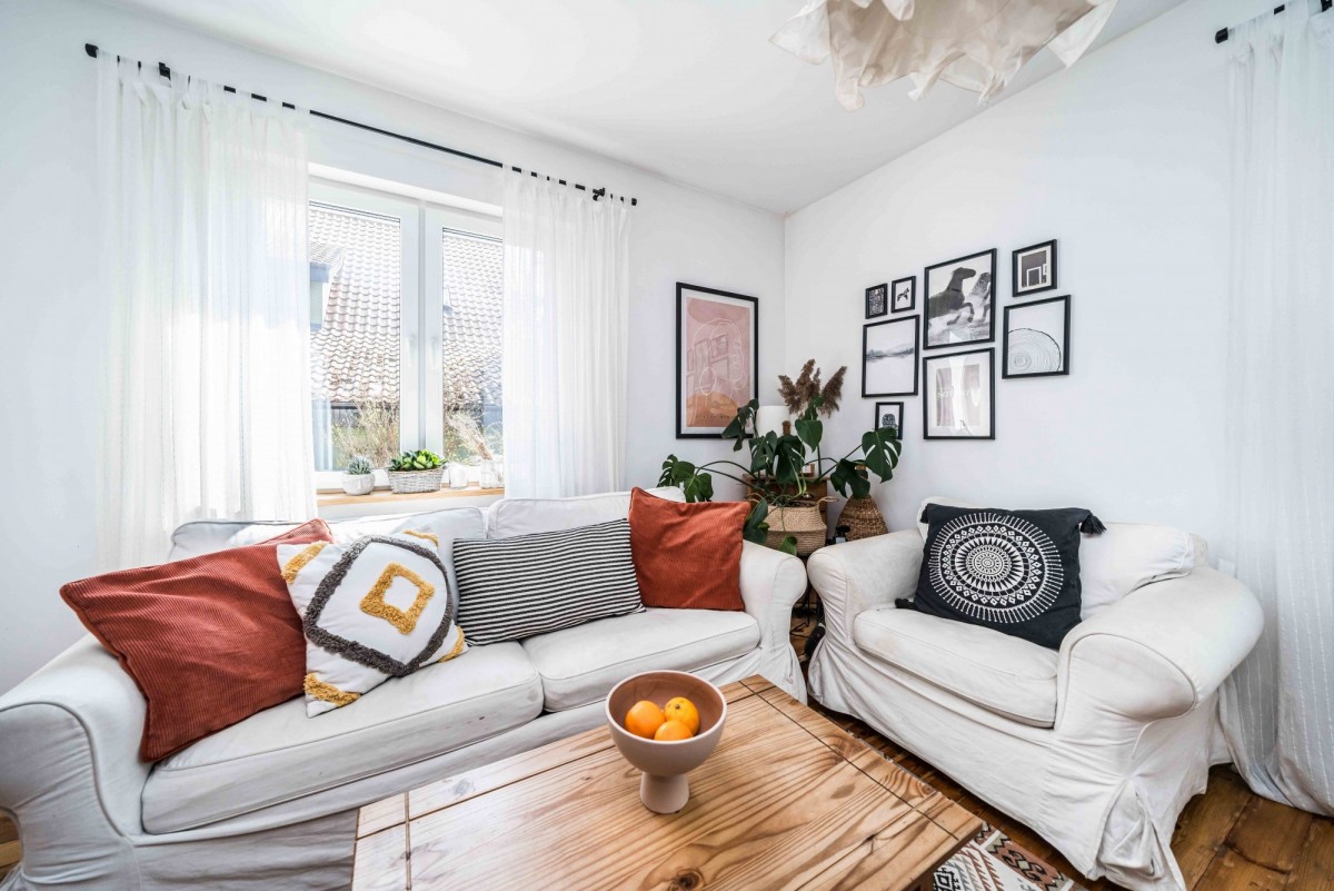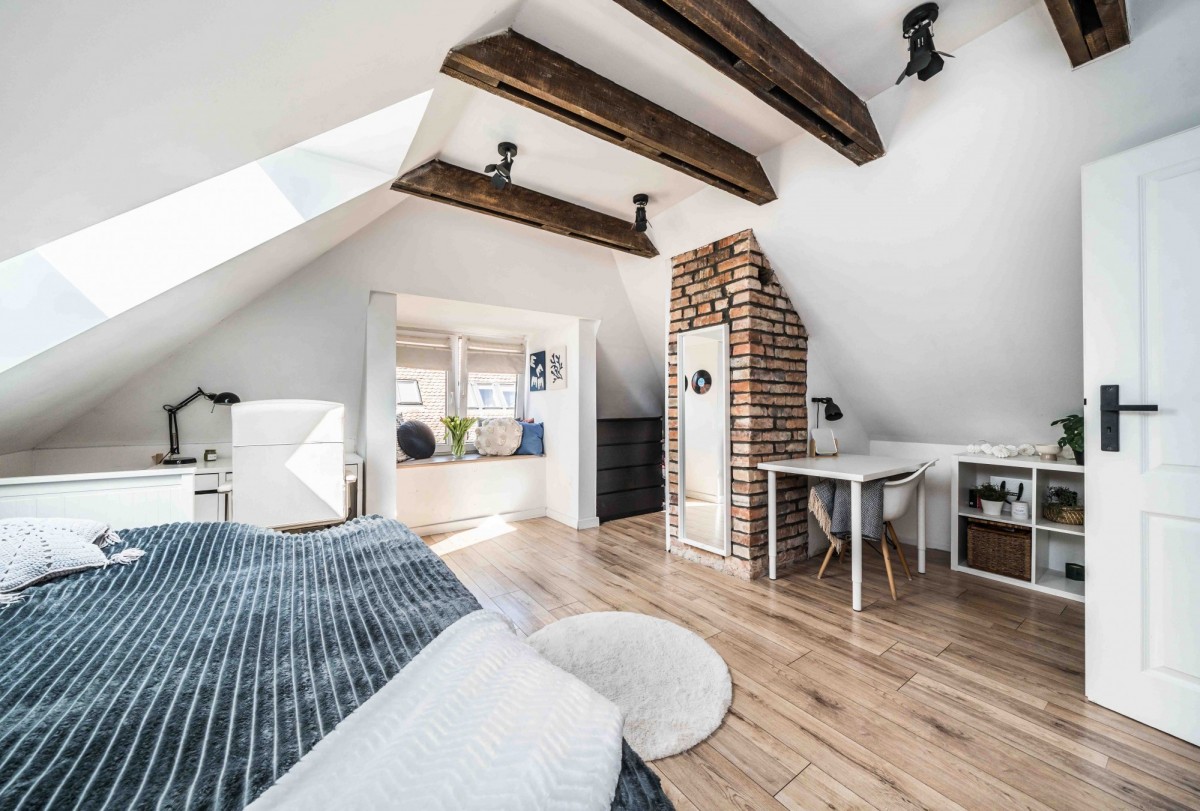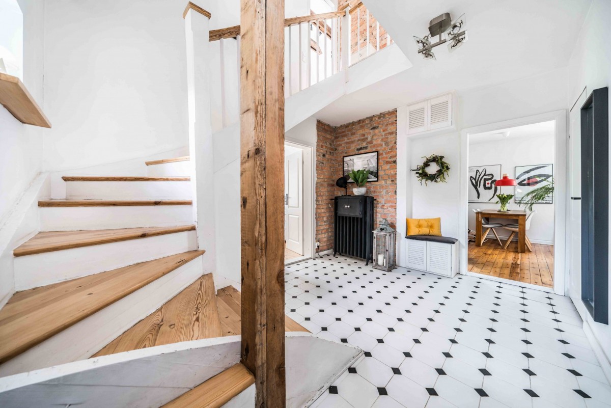 Już od wejścia uwagę zwraca wyjątkowy klimat wnętrz. Naturalne drewniane podłogi, ceglane ściany, jasne pomieszczenia oraz starannie dobrane detale tworzą ciepłą, przytulną i bardzo autentyczną przestrzeń. To dom, który ma swoją historię, ale jednocześnie daje komfort codziennego życia i duży potencjał dalszej aranżacji.