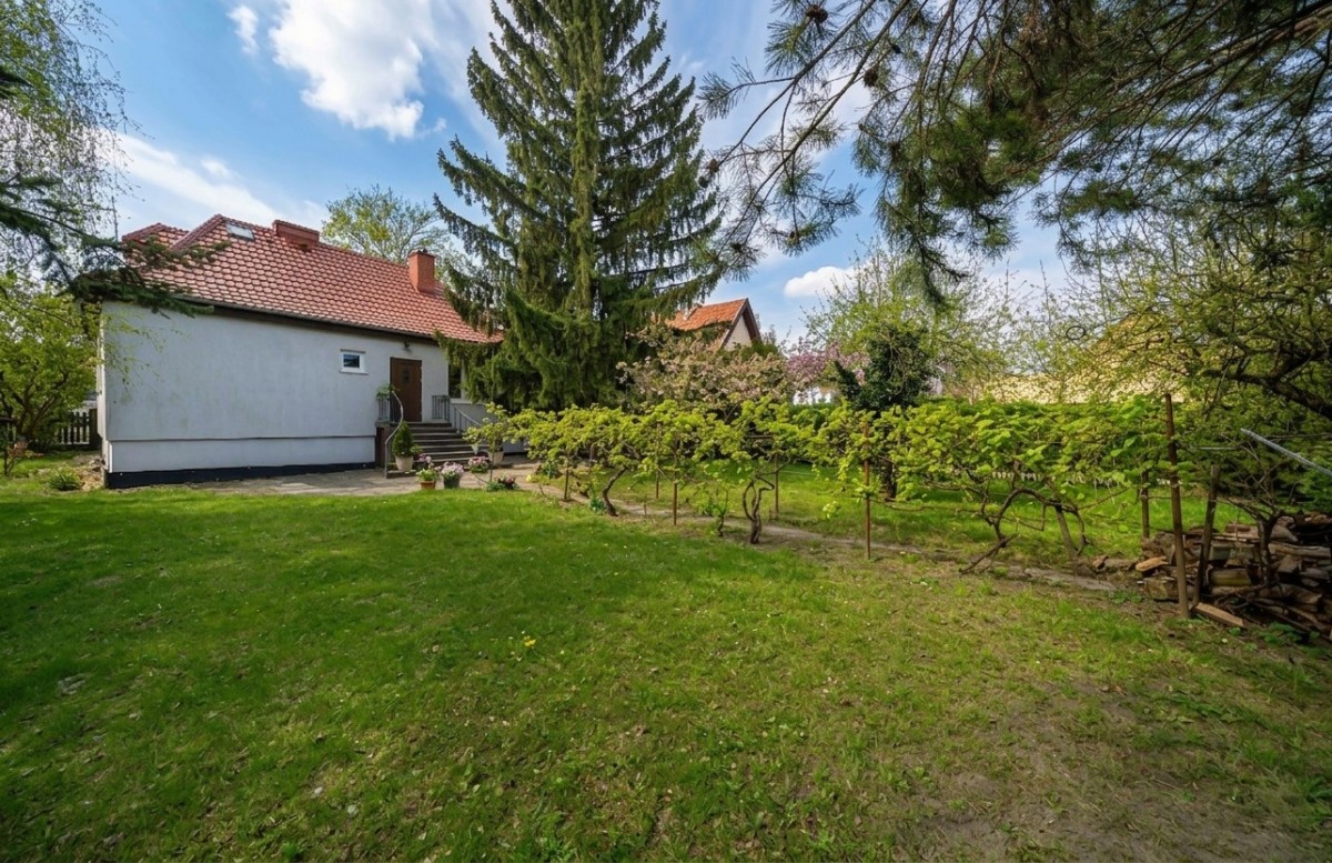 Dużym atutem nieruchomości jest ogród otaczający dom. To zielona, kameralna przestrzeń porośnięta starodrzewem i winoroślą. W ogrodzie znajdują się również maliny oraz jabłonie, a dodatkowe miejsce daje możliwość urządzenia własnego ogródka warzywnego lub strefy wypoczynku.