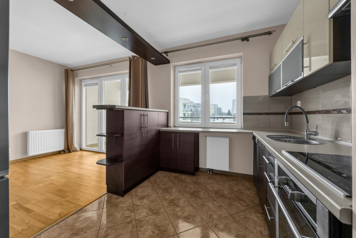 Kuchnia wyposażona w kompletny sprzęt AGD (lodówka, płyta, piekarnik, zmywarka, okap), Lokal gotowy do zamieszkania od zaraz.