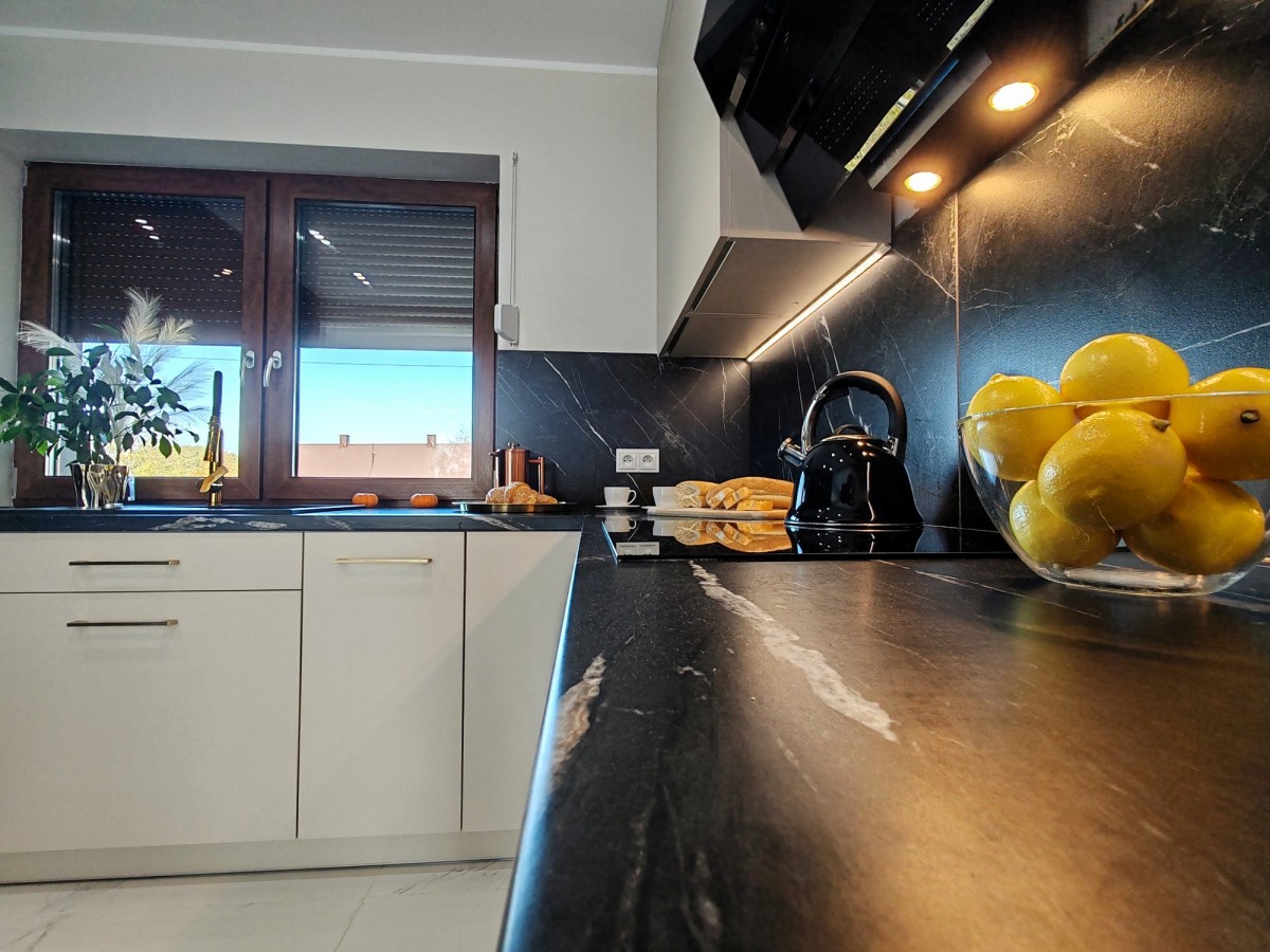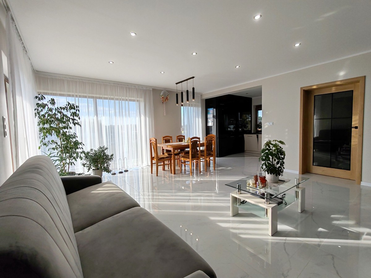Ten wyjątkowy dom, wykończony w 2024 roku, powstał z myślą o wygodzie mieszkańców. Każdy detal – od elewacji po wnętrza – został starannie przemyślany, a zastosowane wysokiej jakości materiały pochodzą od renomowanych producentów. Warto zobaczyć go po zmroku, bo efektowna iluminacja elewacji podkreśla charakter posesji i tworzy wyjątkowy klimat w ogrodzie.