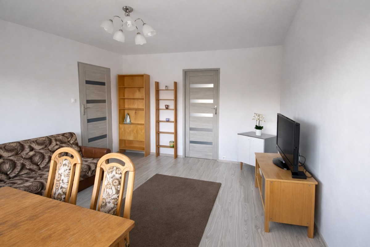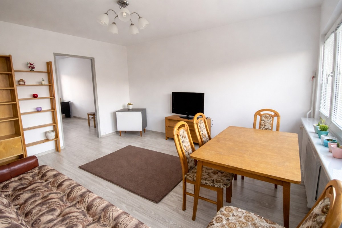 – przechodniego przestronnego salonu/pokoju z rozkładaną sofą, stołem oraz krzesłami,