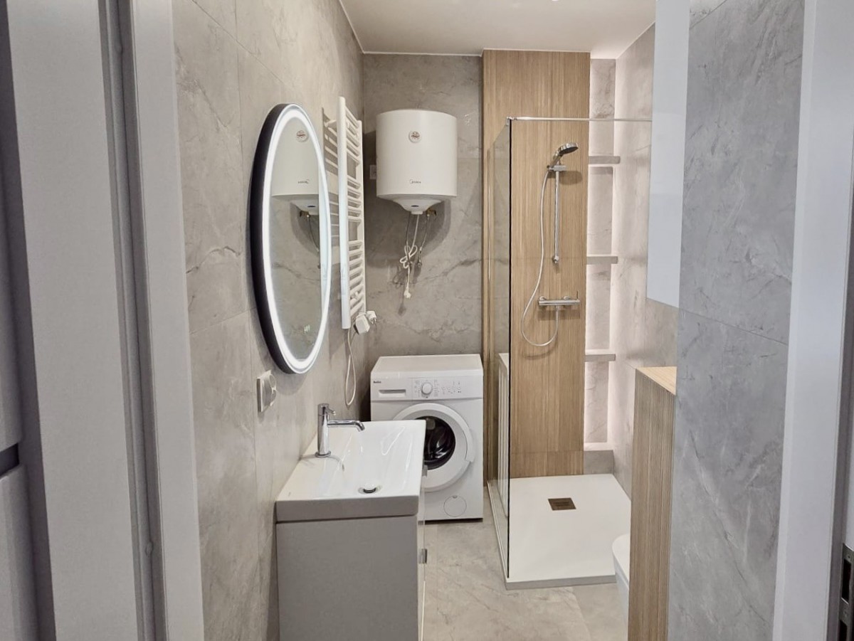 W przedpokoju znajduje się pojemna, nowoczesna szafa przesuwna z lustrami, która optycznie powiększa przestrzeń. Łazienka – wykończona wielkoformatowymi płytkami o wzorze marmuru, z komfortową kabiną typu walk-in, efektownym podświetlanym lustrem LED oraz nową pralką. Całość dopełniają wysokiej jakości panele podłogowe oraz eleganckie, białe drzwi z czarnymi okuciami. Z salonu wyjście prowadzi na balkon. Do mieszkania przynależy prywatne miejsce postojowe w hali garażowej, co zapewnia komfort parkowania o każdej porze roku.