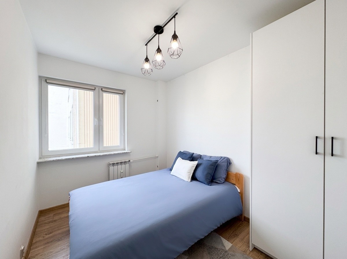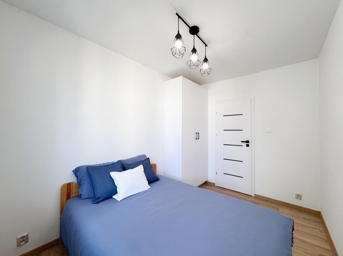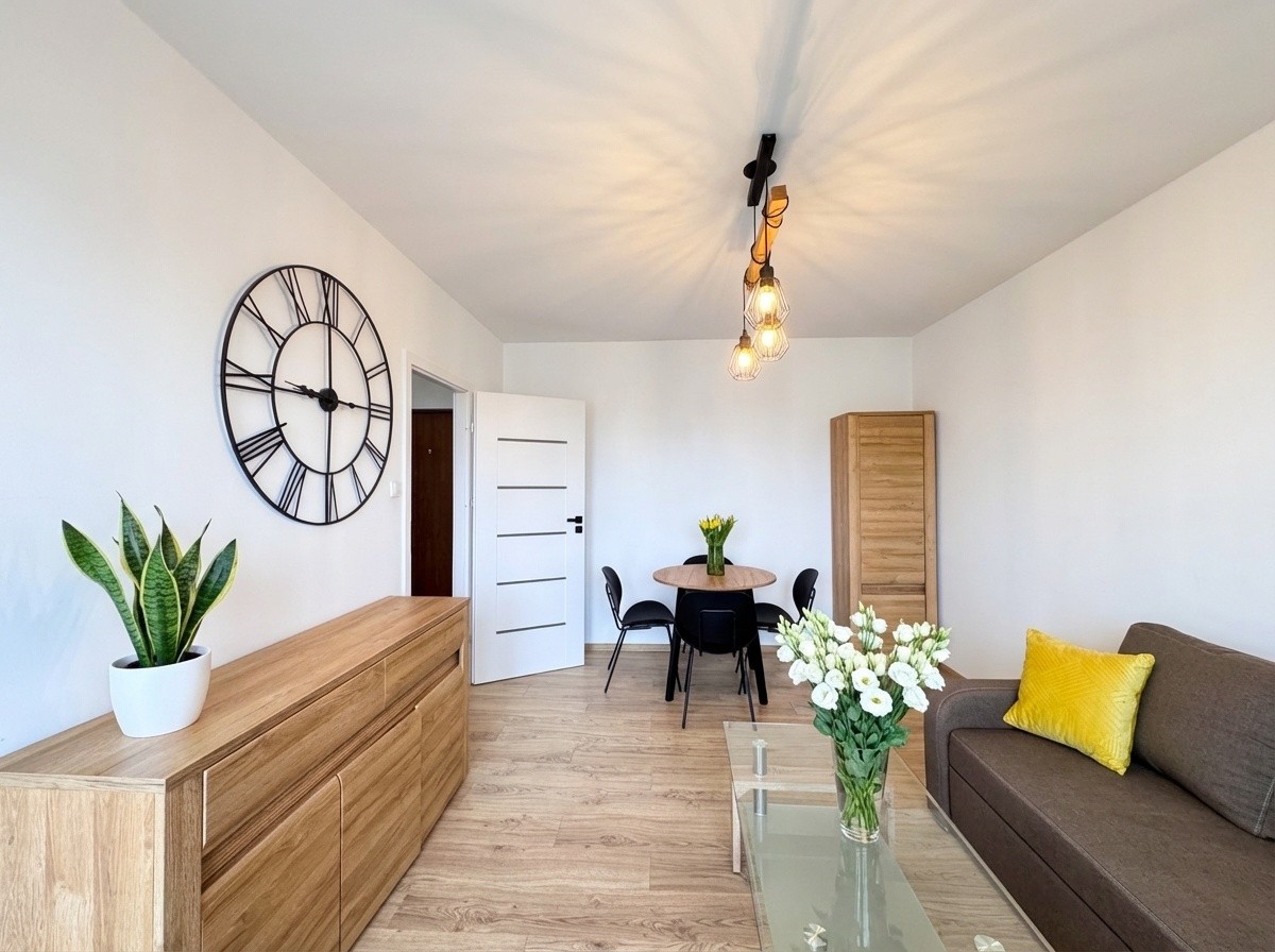 Lokal przeszedł gruntowny remont 2 lata temu. Zostały wymienione piony wodno-kanalizacyjne, instalacja elektryczna, okna na 3-szybowe oraz grzejniki. Kuchnia również posiada meble pod wymiar oraz pełne wyposażenie (piekarnik, płyta indukcyjna, pochłaniacz, lodówka, zmywarka). W sypialni umieszczono solidne łóżko wykonane przez stolarza oraz pojemną szafę. Łazienka oraz oddzielne WC zostały wykończone wielkoformatowymi płytkami imitującymi szary marmur. W salonie znajduje się narożnik, komoda, rozkładany stół z krzesłami zamknięty regał oraz szklany stolik. Całe widoczne wyposażenie pozostaje w cenie mieszkania.